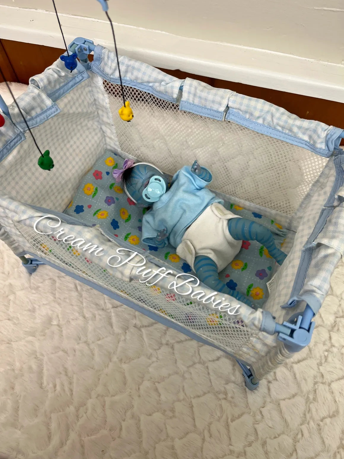 Creating Liel, was definitely different from any other reborn I’ve created. She is the tiniest reborn I have ever made! She is only 8 inches long 😍 Sooo freakin cute!!! Liel started out as the blank vinyl kit “Wynter” sculpted by Shawna Clymer. I began her reborn process by applying multiple various transparent blues and other colors to to get the desired skin complexion I envisioned to give her the most realistic skin tone look with depth and detail. I wish I could tell you how many layers it took me to get her look the beautiful way she is, but to be honest I lost track of count 😅. It was so much fun for me add her own tribal stripes and spotted, freckley dots and the coolest tiny Mohawk you have probably ever seen. I feel like these features really helped captivate her uniqueness and personality. Which by the way, she has the sweetest, funky personality and she has a love for flowers and butterflies 🦋 Anyways I am super pleased with how she has turned out and I can’t wait for you to adopt her 🥰. Aaah, yes! I’ll miss her and the bond we share, but I will be way more happy for her to be in your loving arms with a stronger bond. When you look at Liel and she just tugs at your heart, that means she is meant for you. Every OOAK reborn is created for one person and if it's you, your life will be brightened by adopting Liel into your home. 💙
