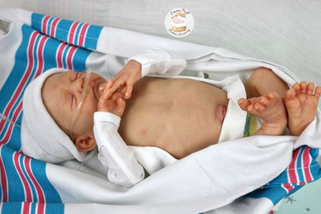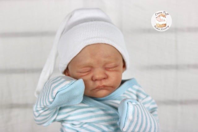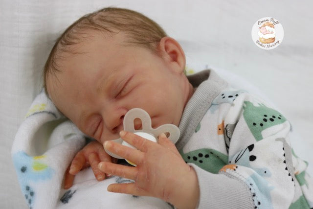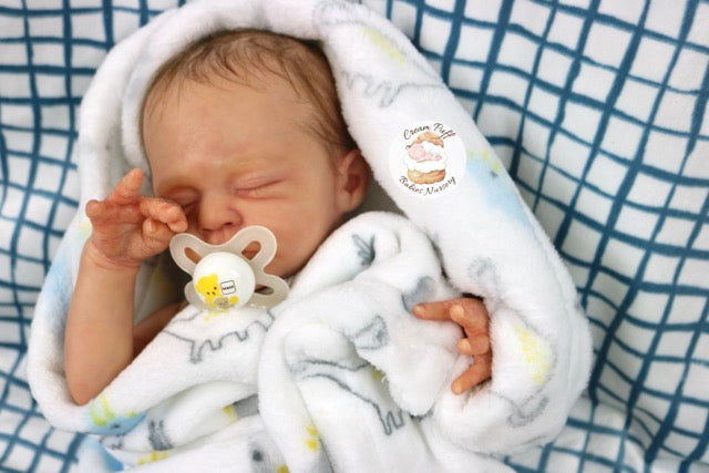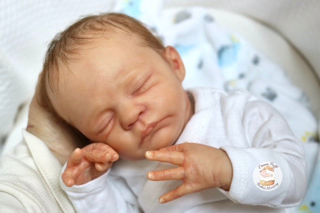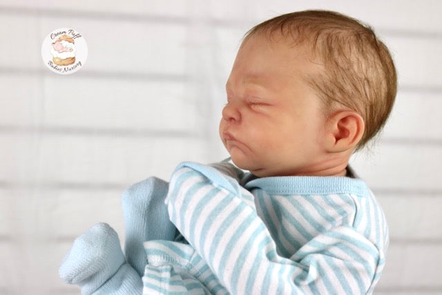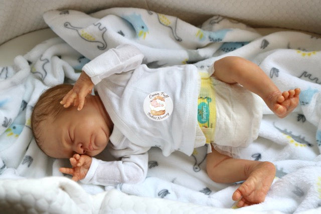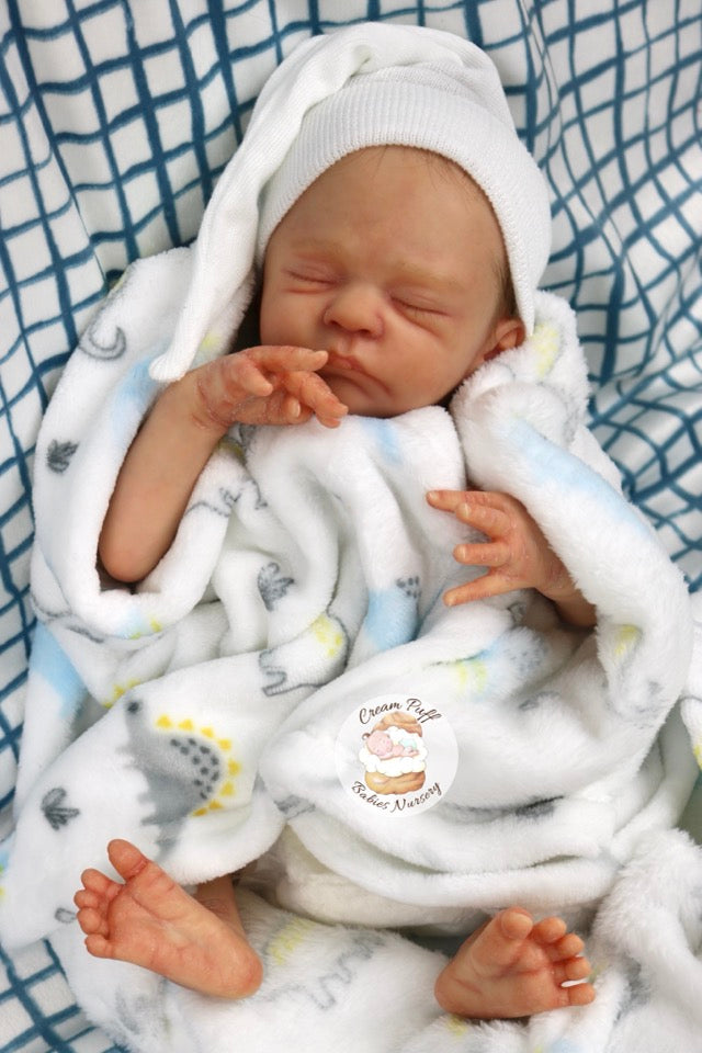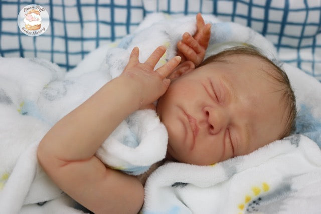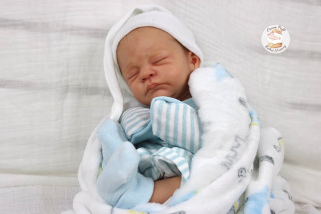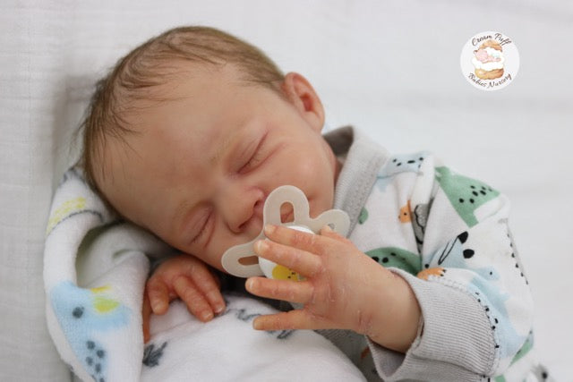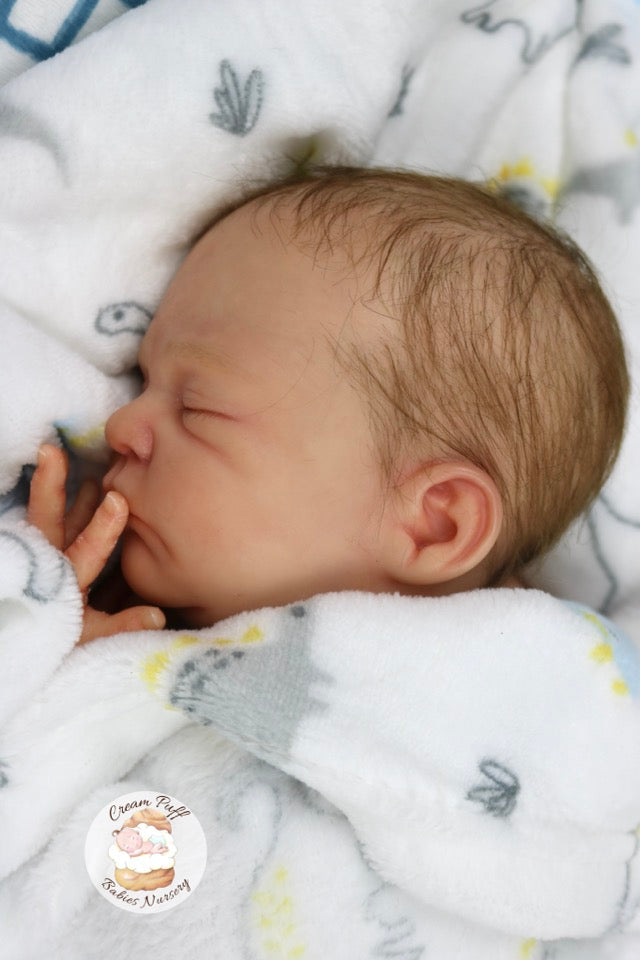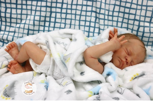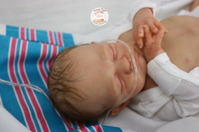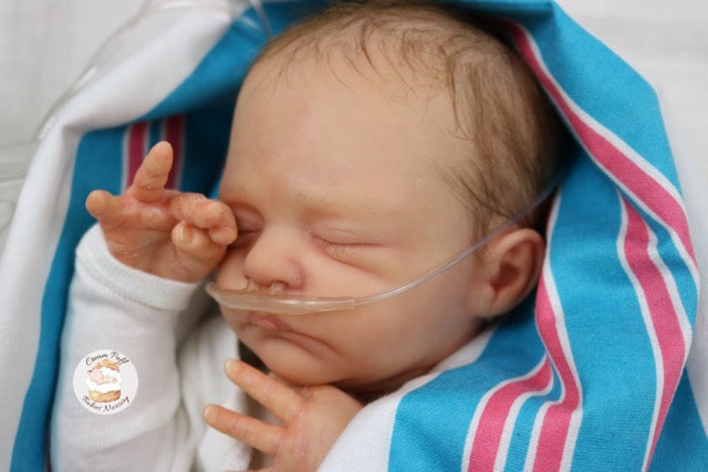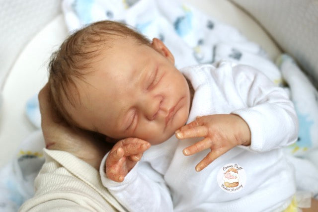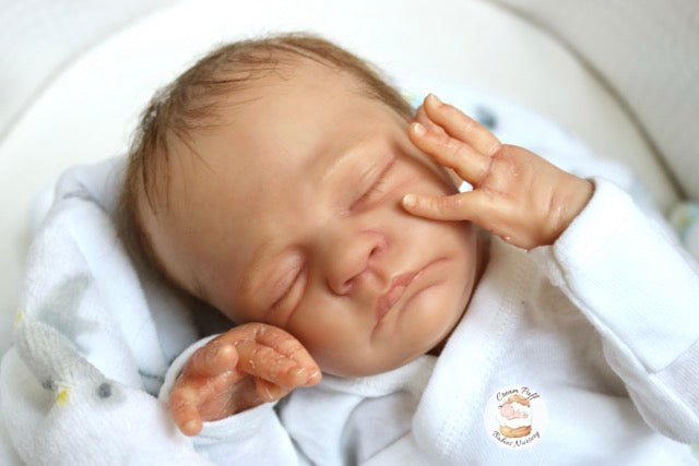 Born a little prematurely, this precious, sleeping, baby boy came into the nursery as “Bam Bam” by Severine Piret The kit to start out with was a blank neutral pale skin tone vinyl and was put through our reborn process to enhance his realism and lifelike, premature newborn look.