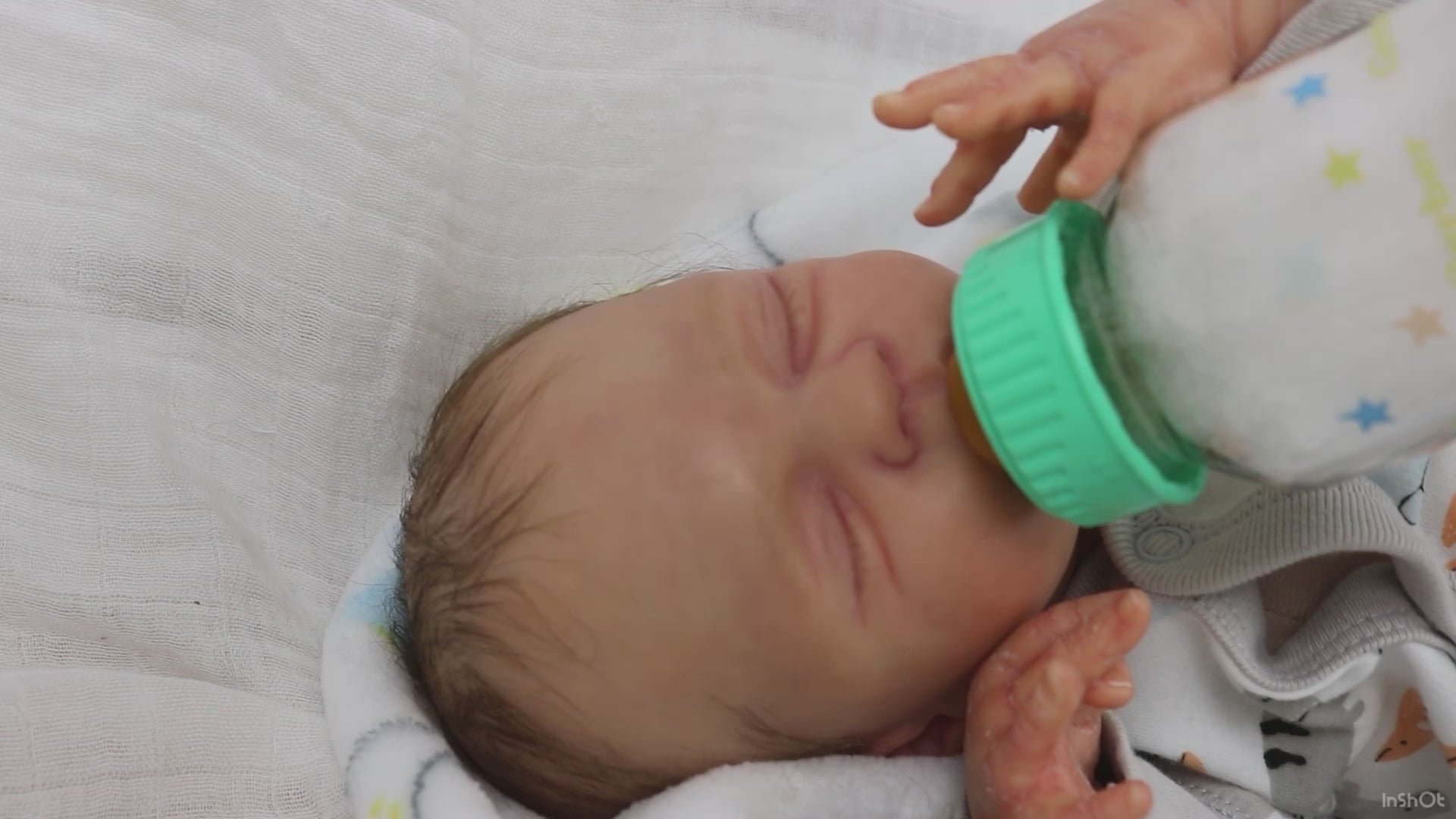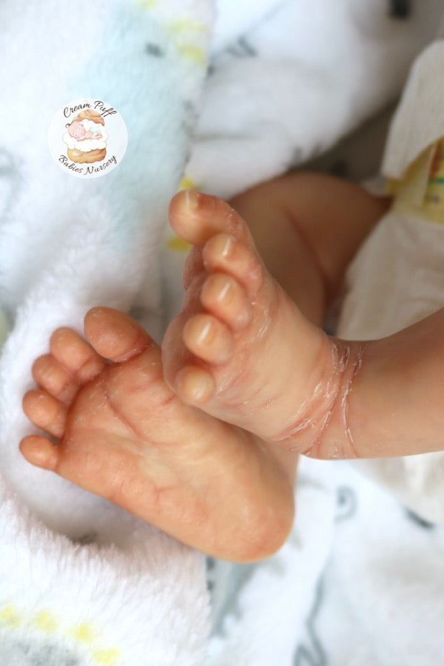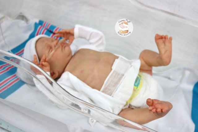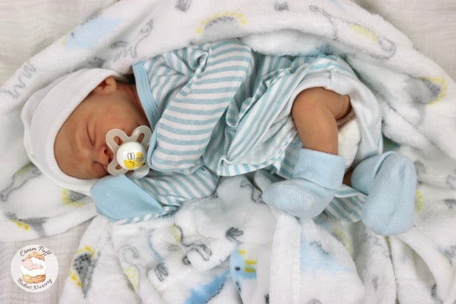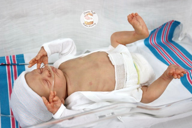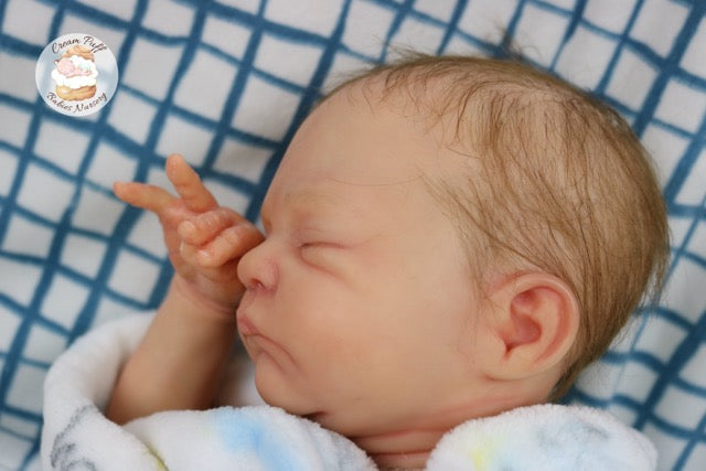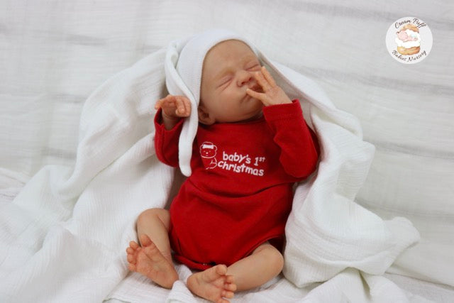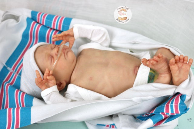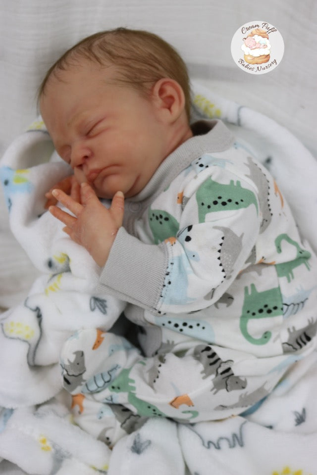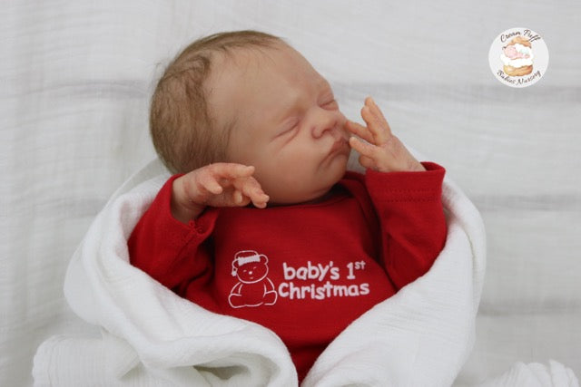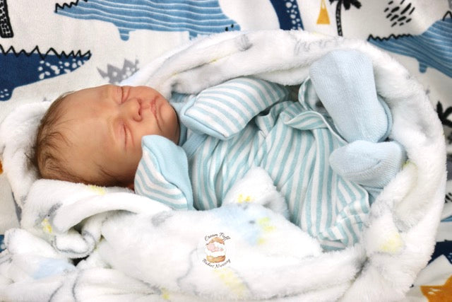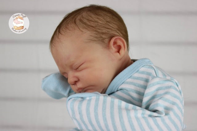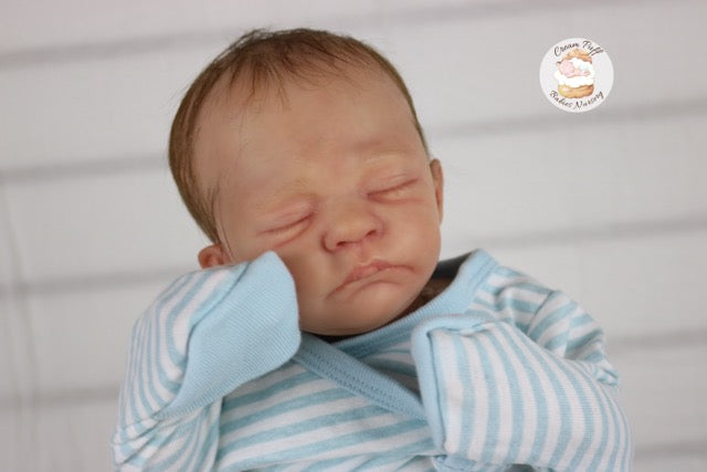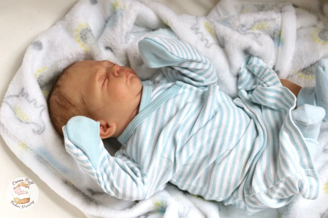 Born a little prematurely, this precious, sleeping, baby boy came into the nursery as “Bam Bam” by Severine Piret The kit to start out with was a blank neutral pale skin tone vinyl and was put through our reborn process to enhance his realism and lifelike, premature newborn look.