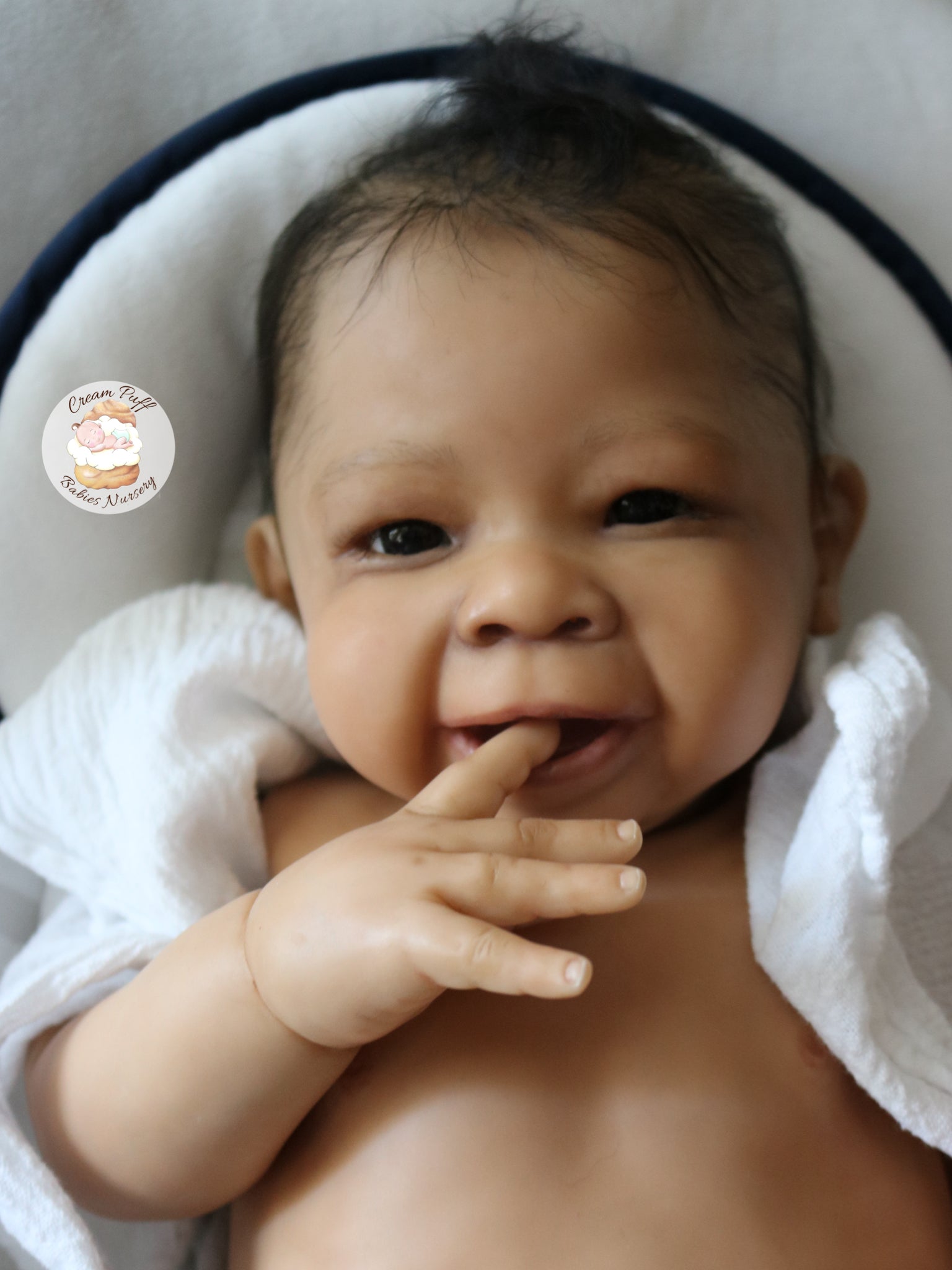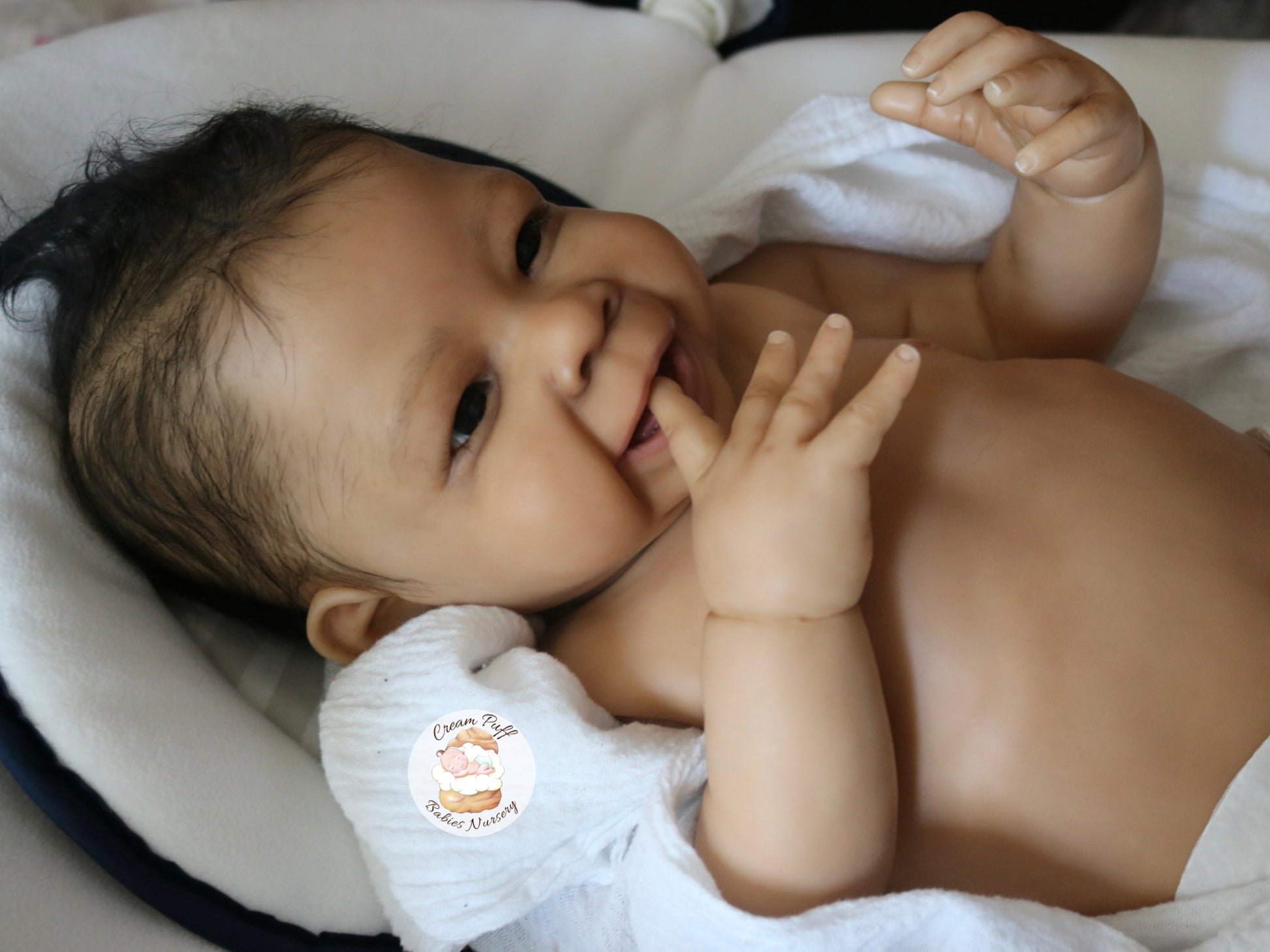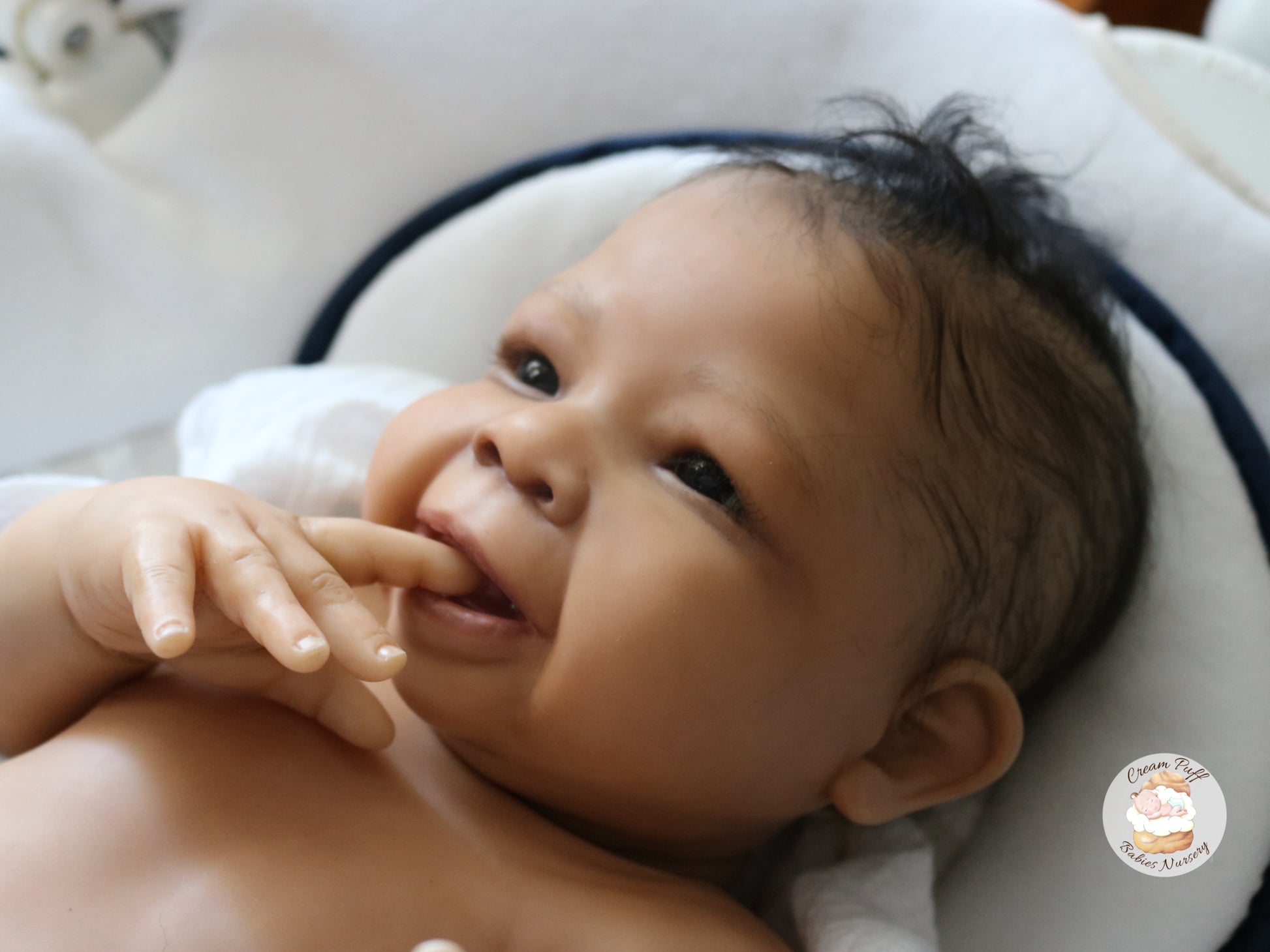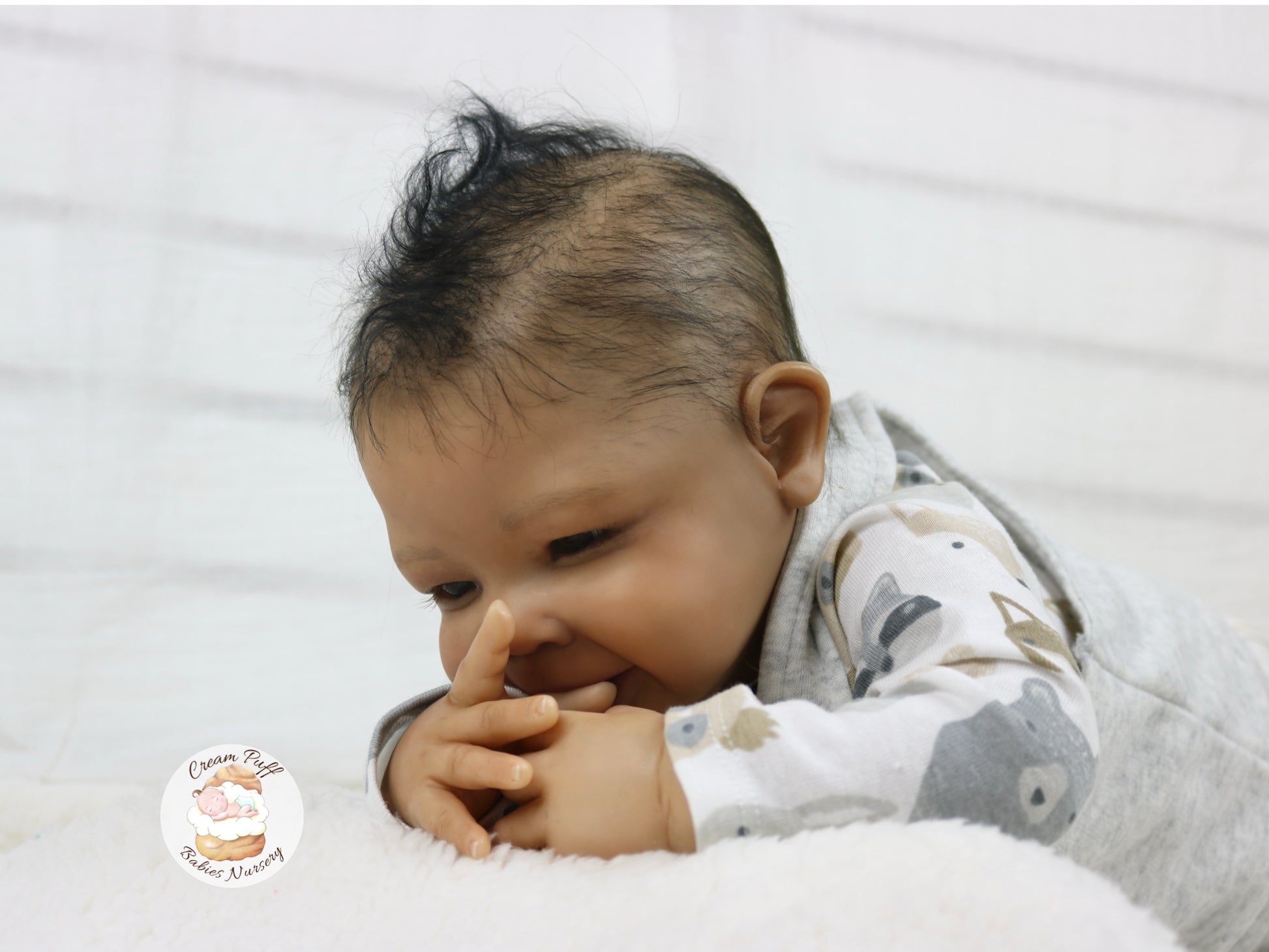 Lovingly brought to life from the “Camilo” kit by renowned sculptor Jorja Pigott, this precious baby boy began his journey as a blank vinyl canvas with a neutral pale skin tone. From there, he was lovingly transformed through the meticulous reborn process into the lifelike little treasure you see here.