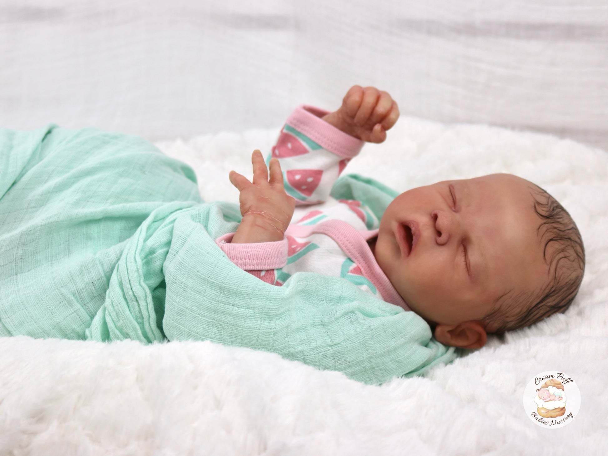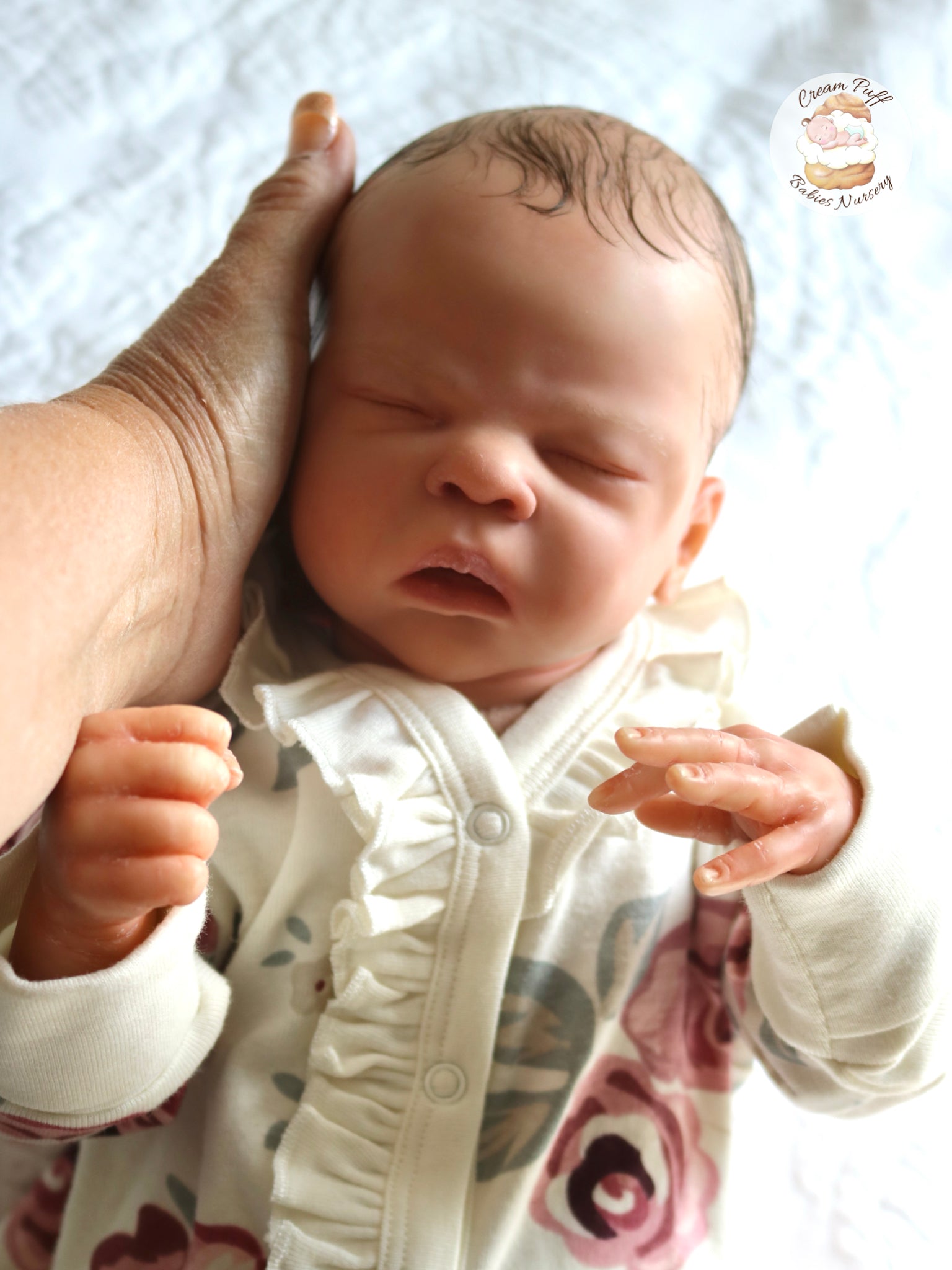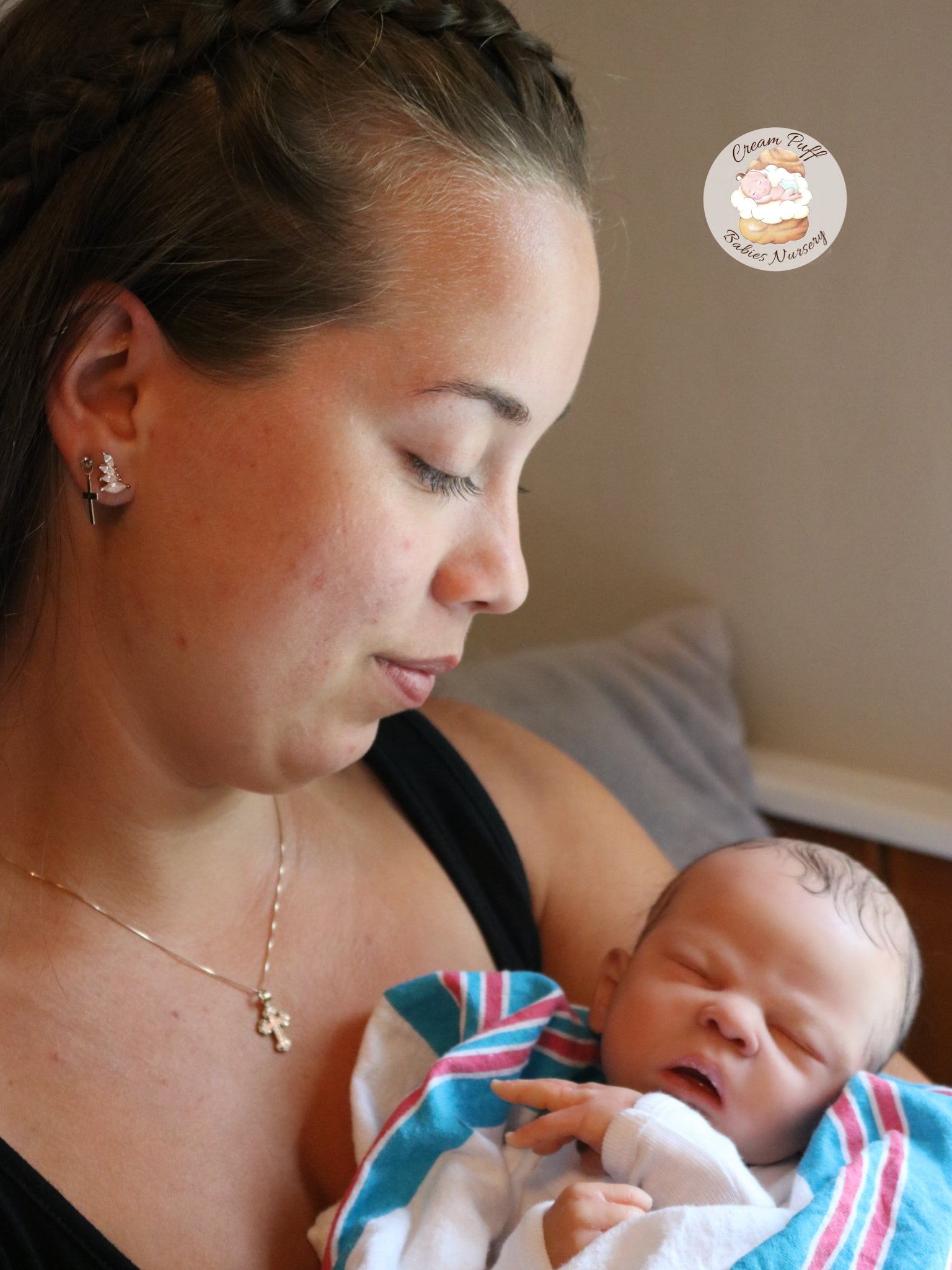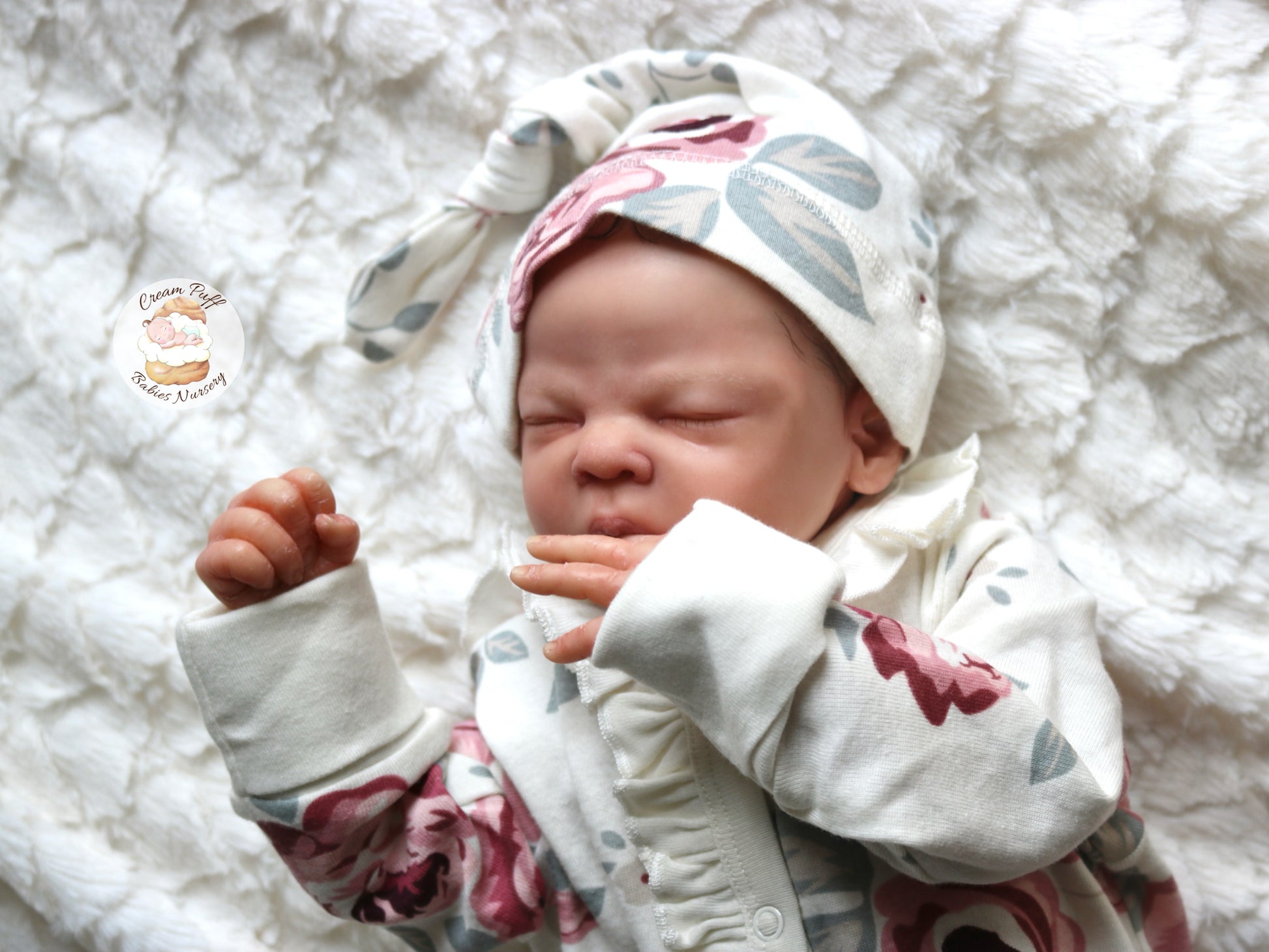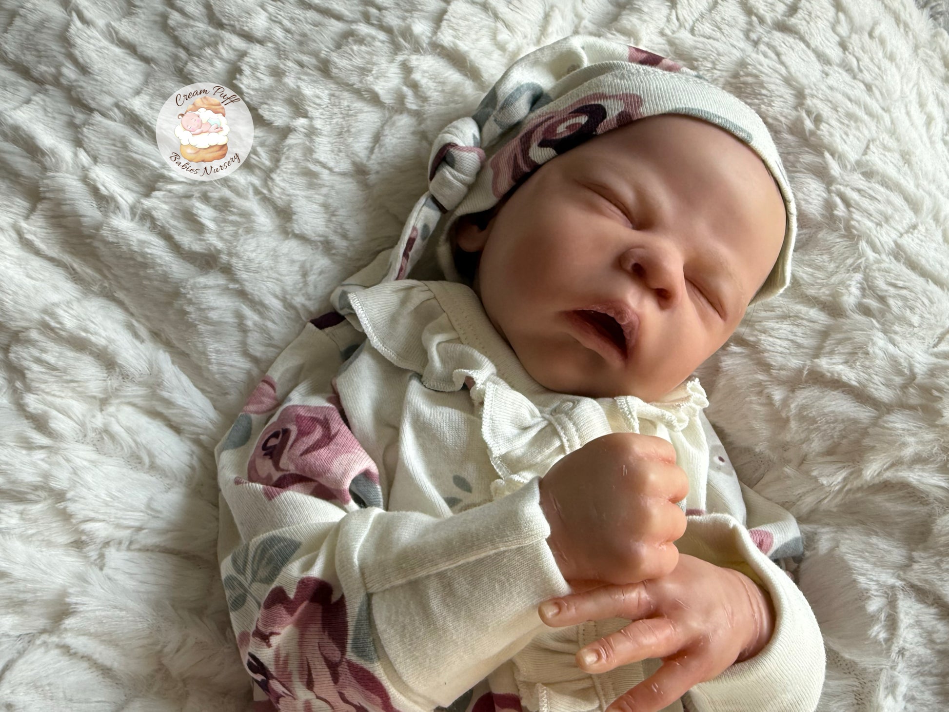 Meet sleepy baby Tyla, a sweet and realistic reborn baby, lovingly created from the rare and sold-out “Toby” kit by Cassie Brace / Cassie Ann Love.