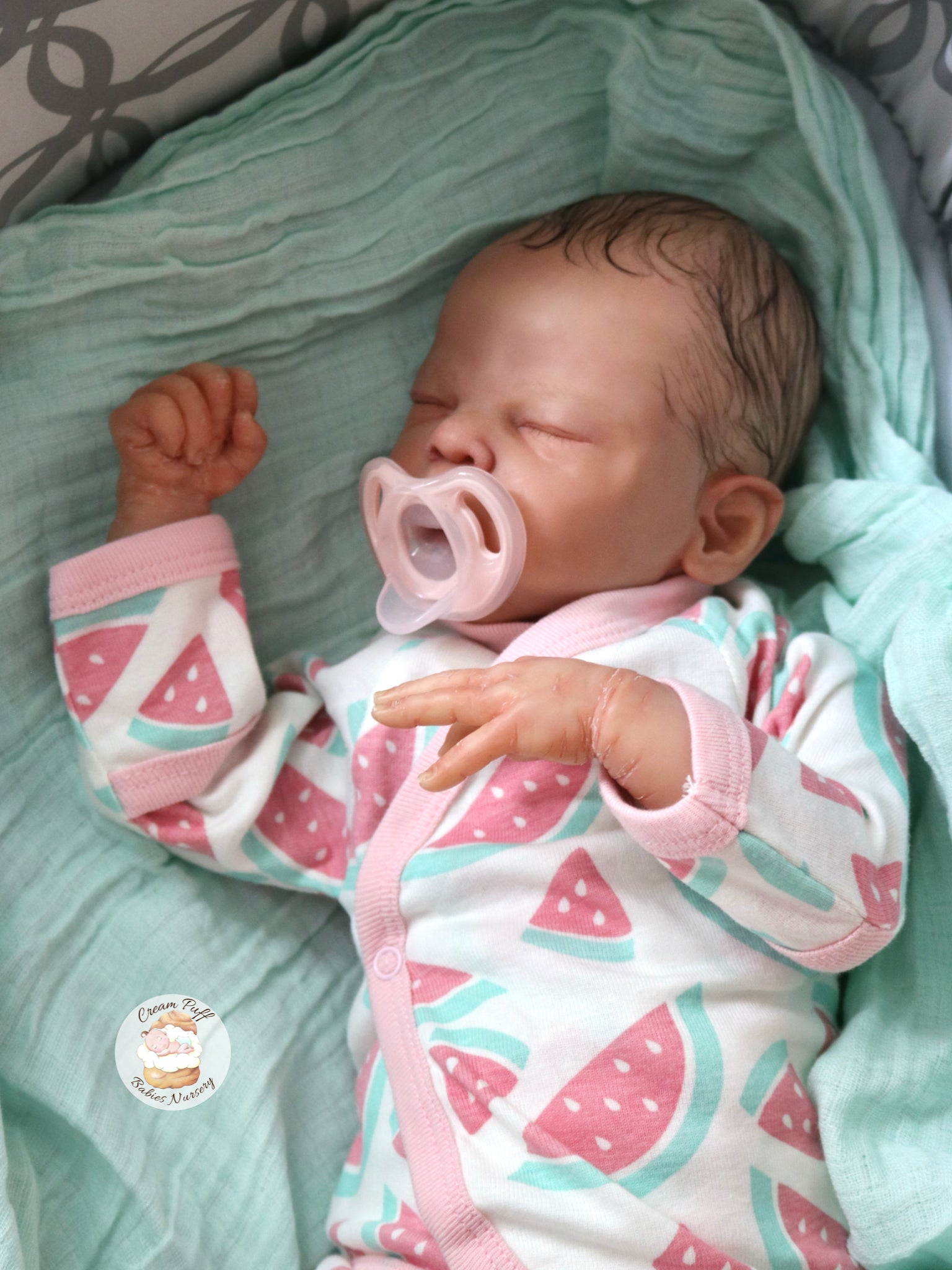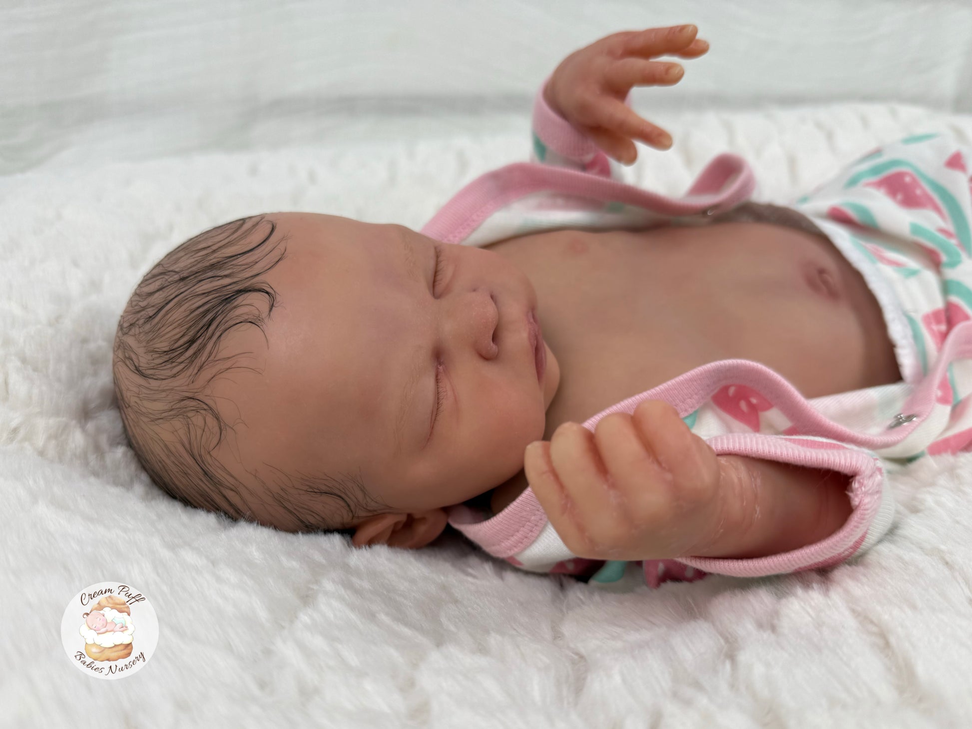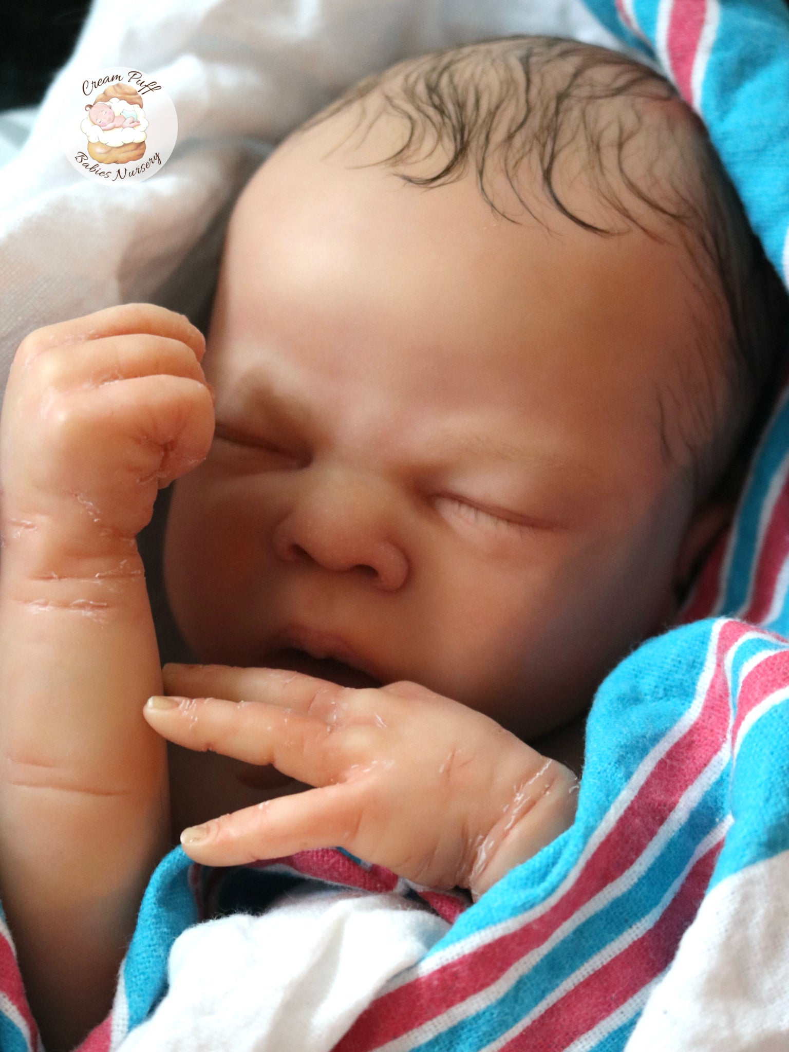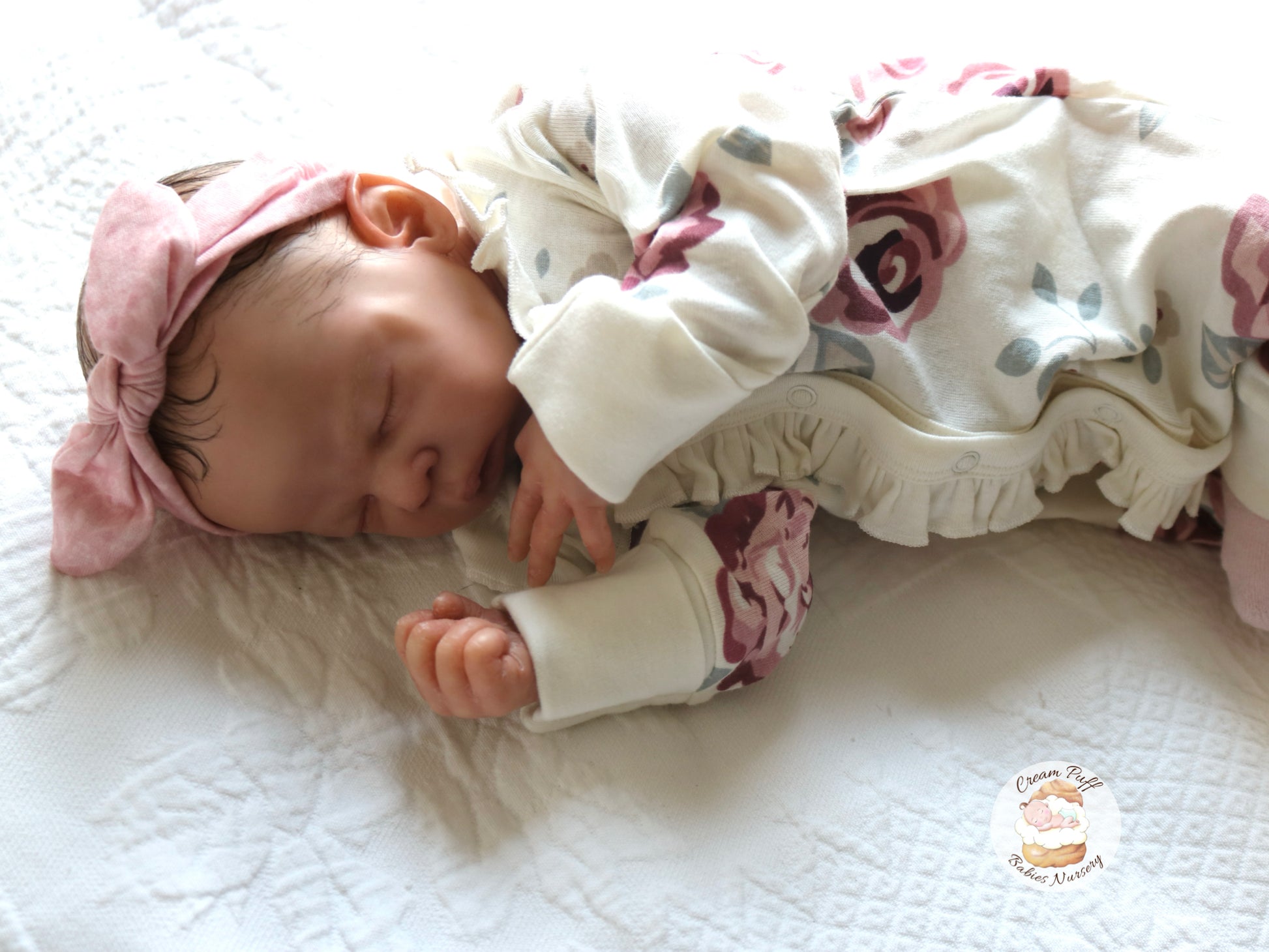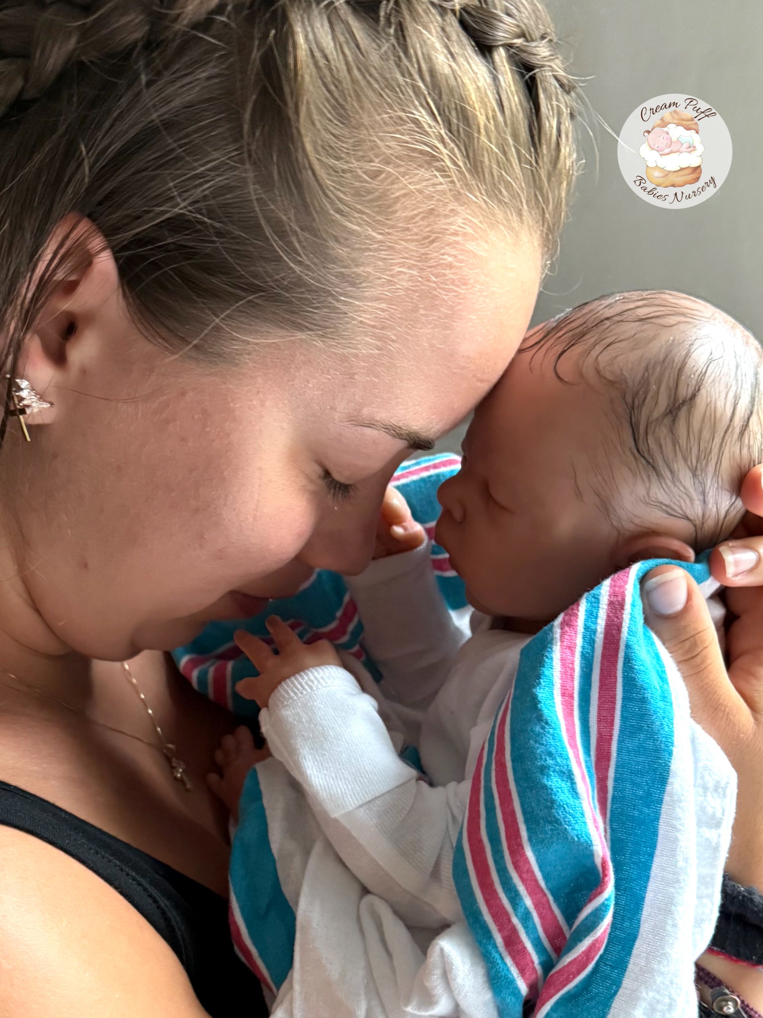 Meet sleepy baby Tyla, a sweet and realistic reborn baby, lovingly created from the rare and sold-out “Toby” kit by Cassie Brace / Cassie Ann Love.