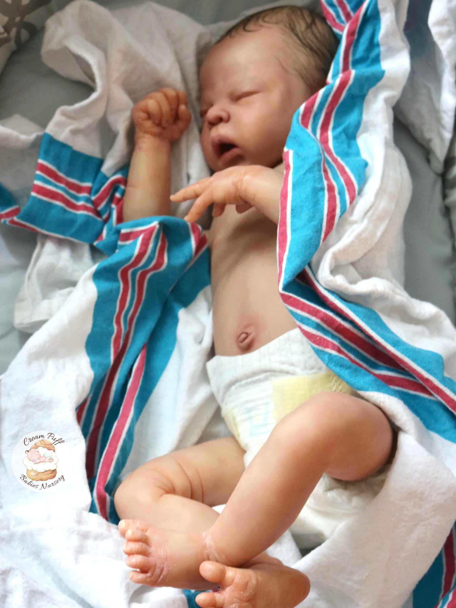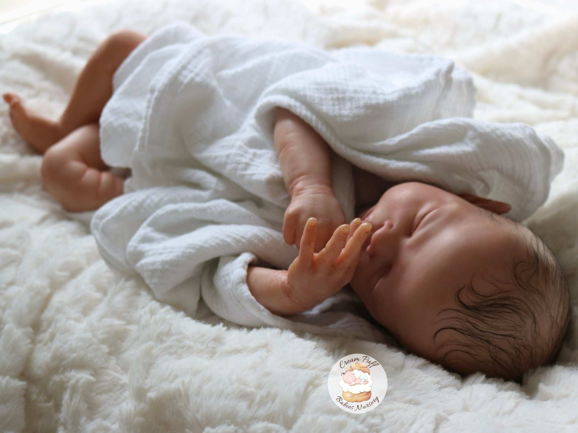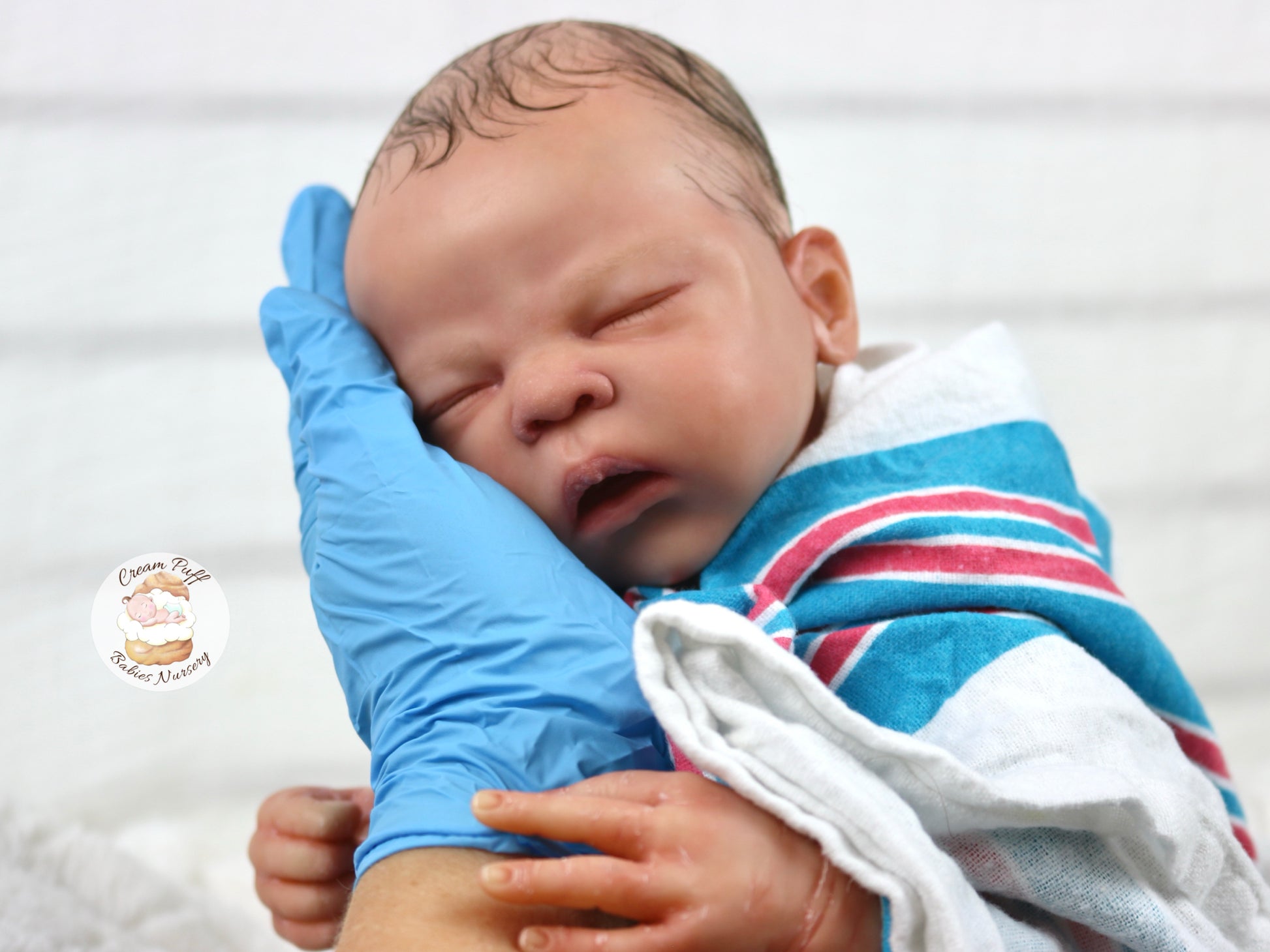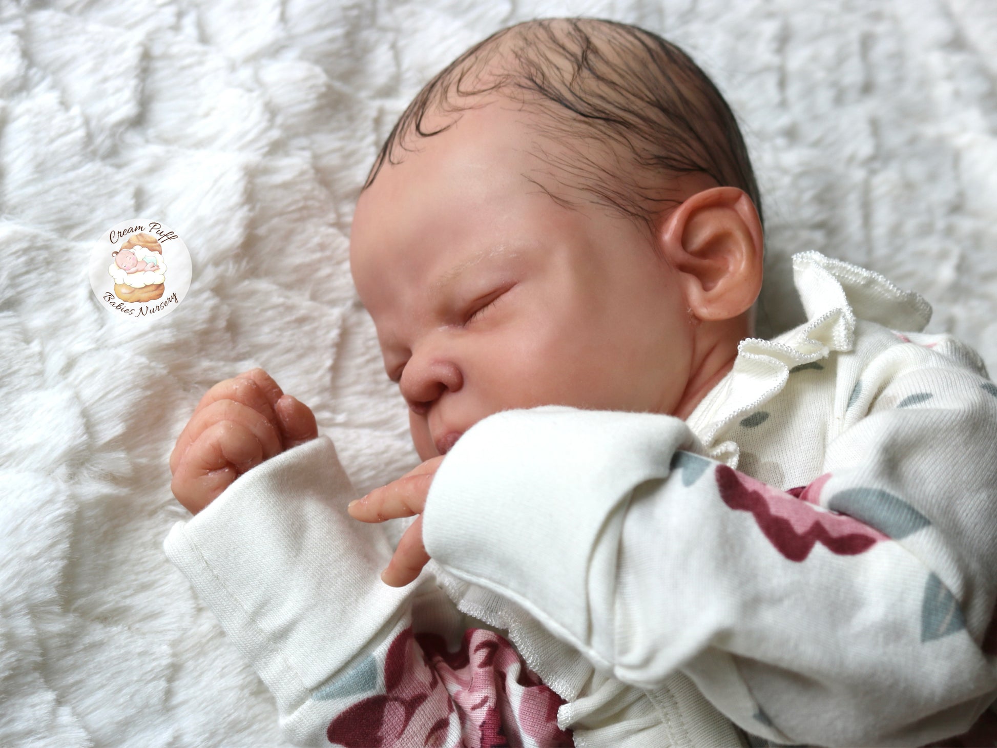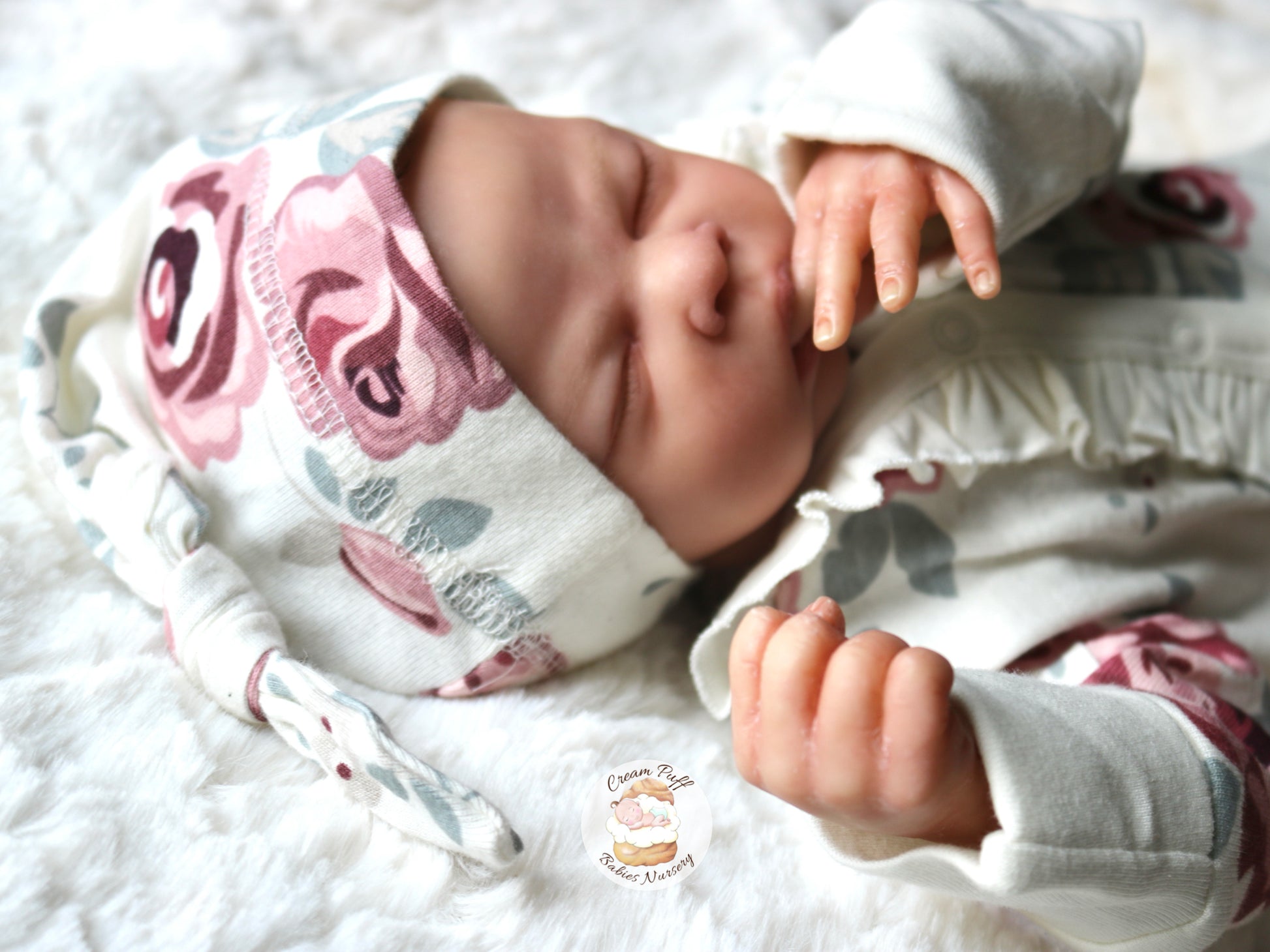 Meet sleepy baby Tyla, a sweet and realistic reborn baby, lovingly created from the rare and sold-out “Toby” kit by Cassie Brace / Cassie Ann Love.