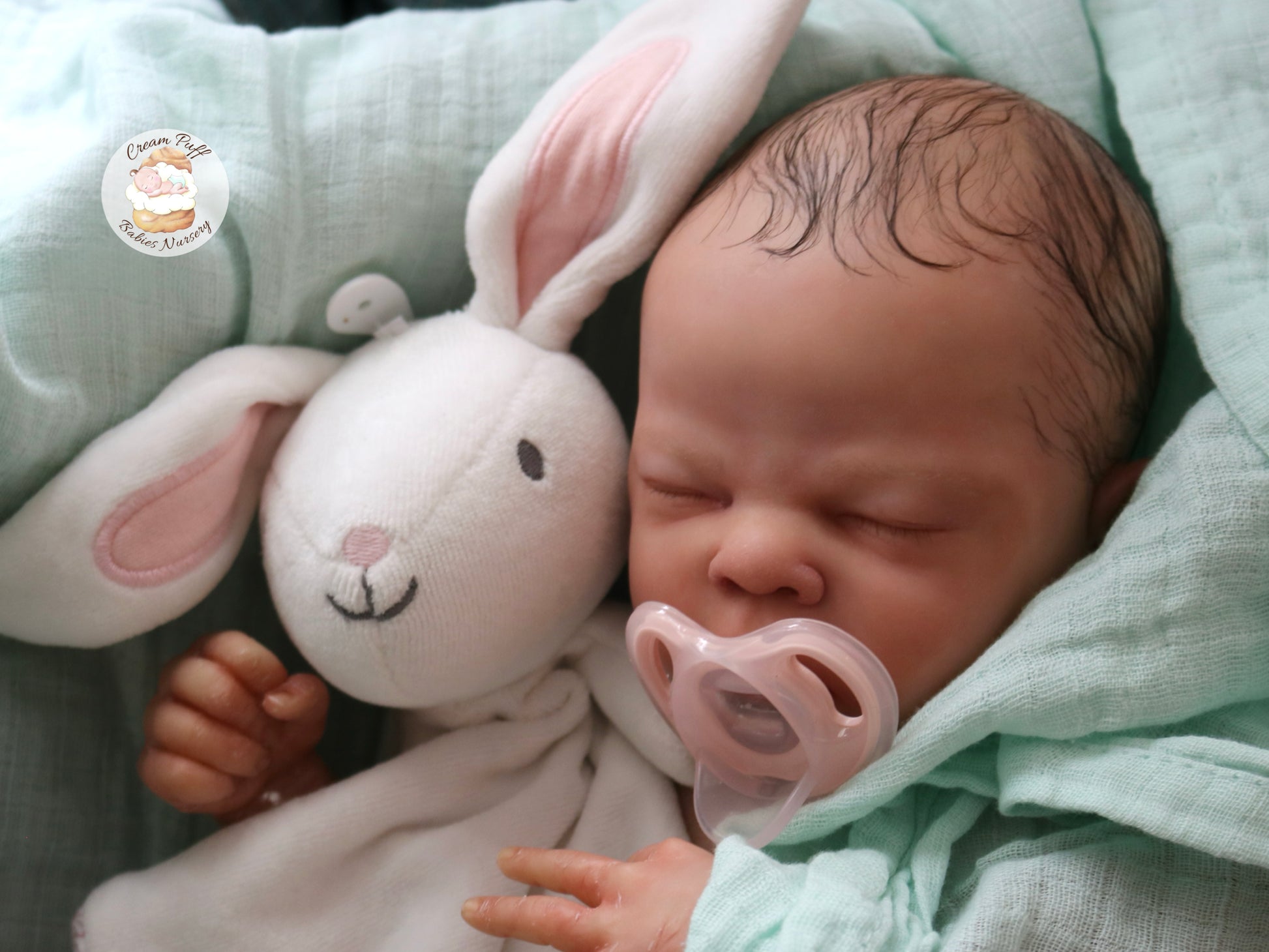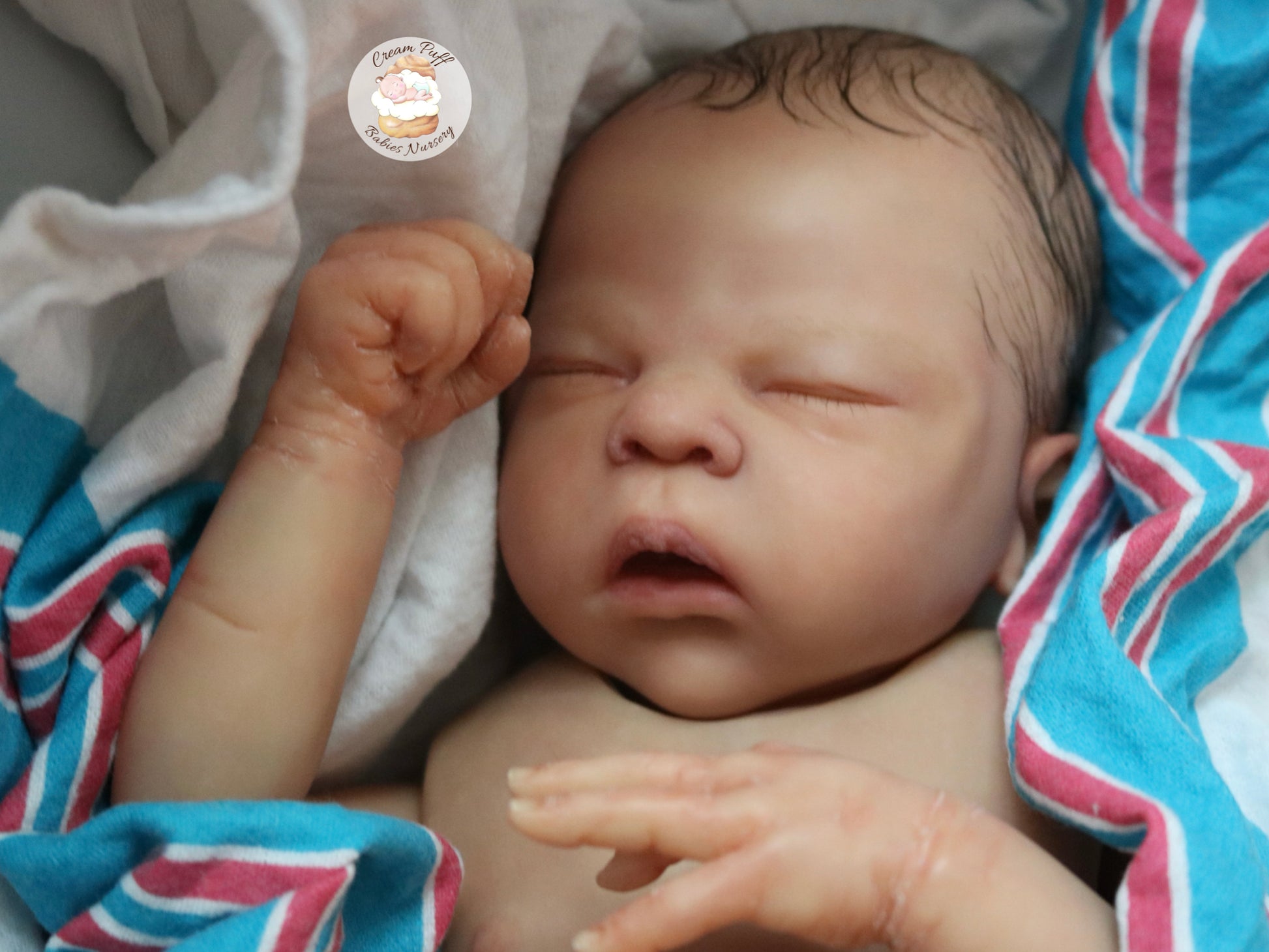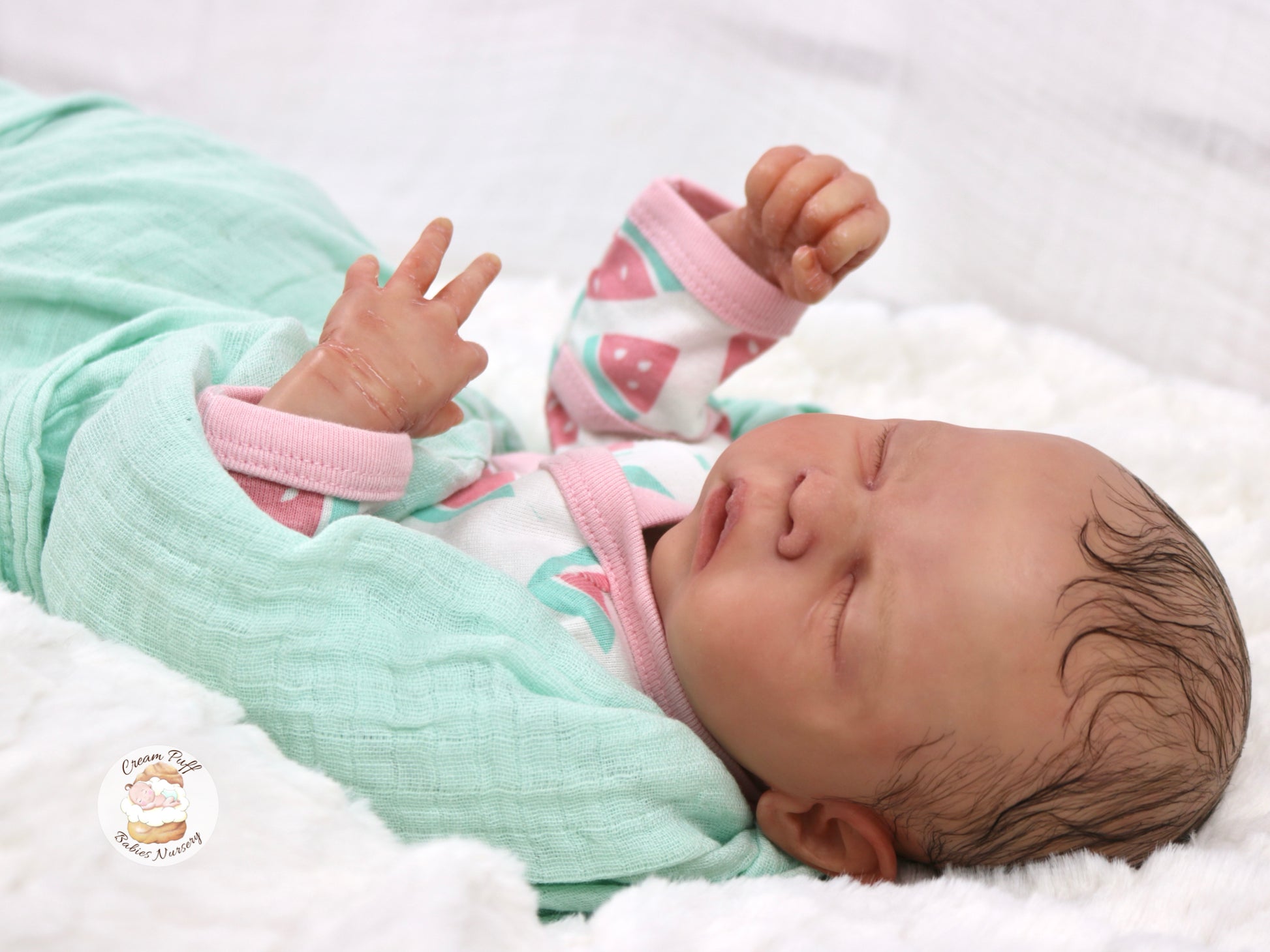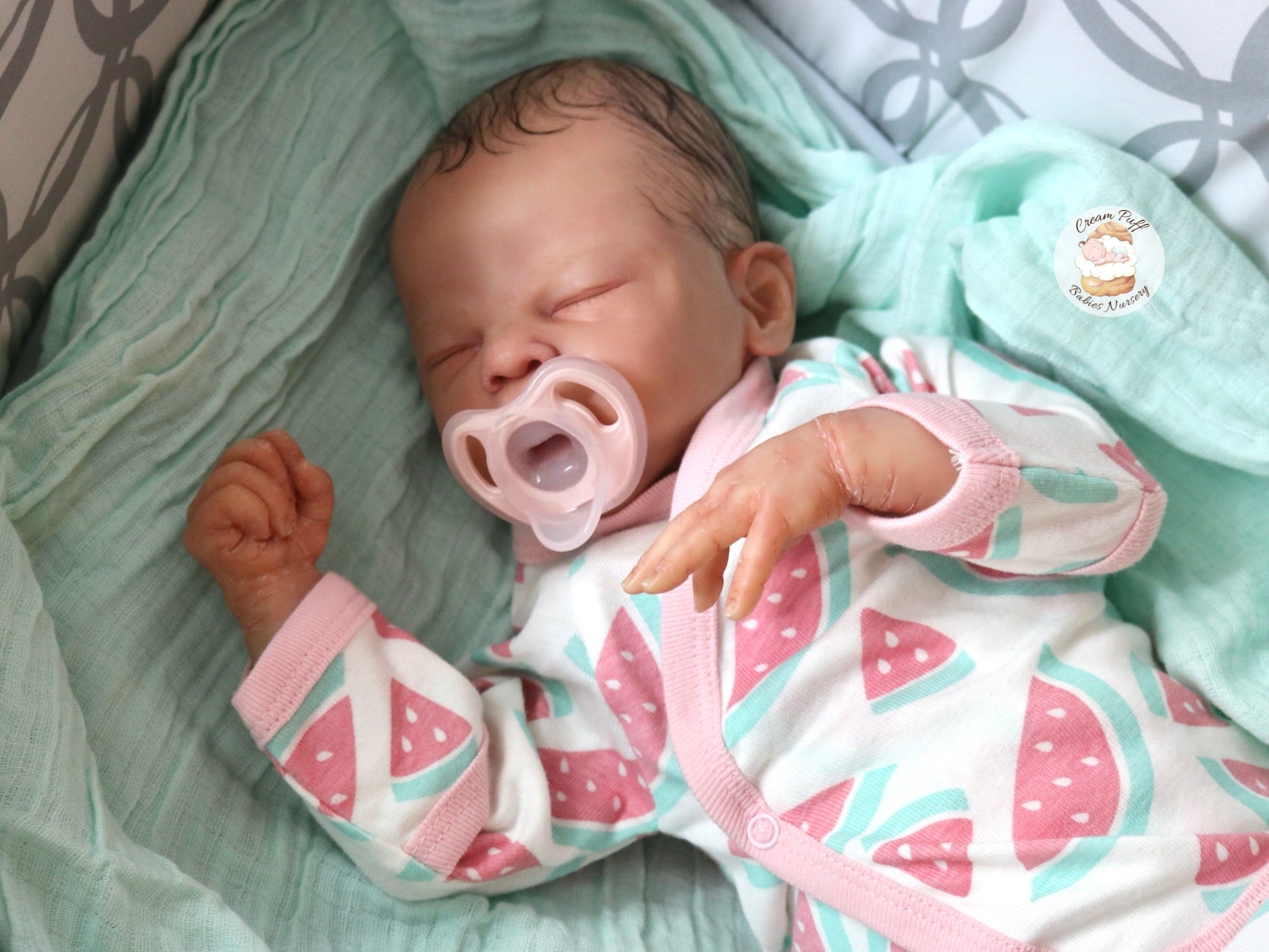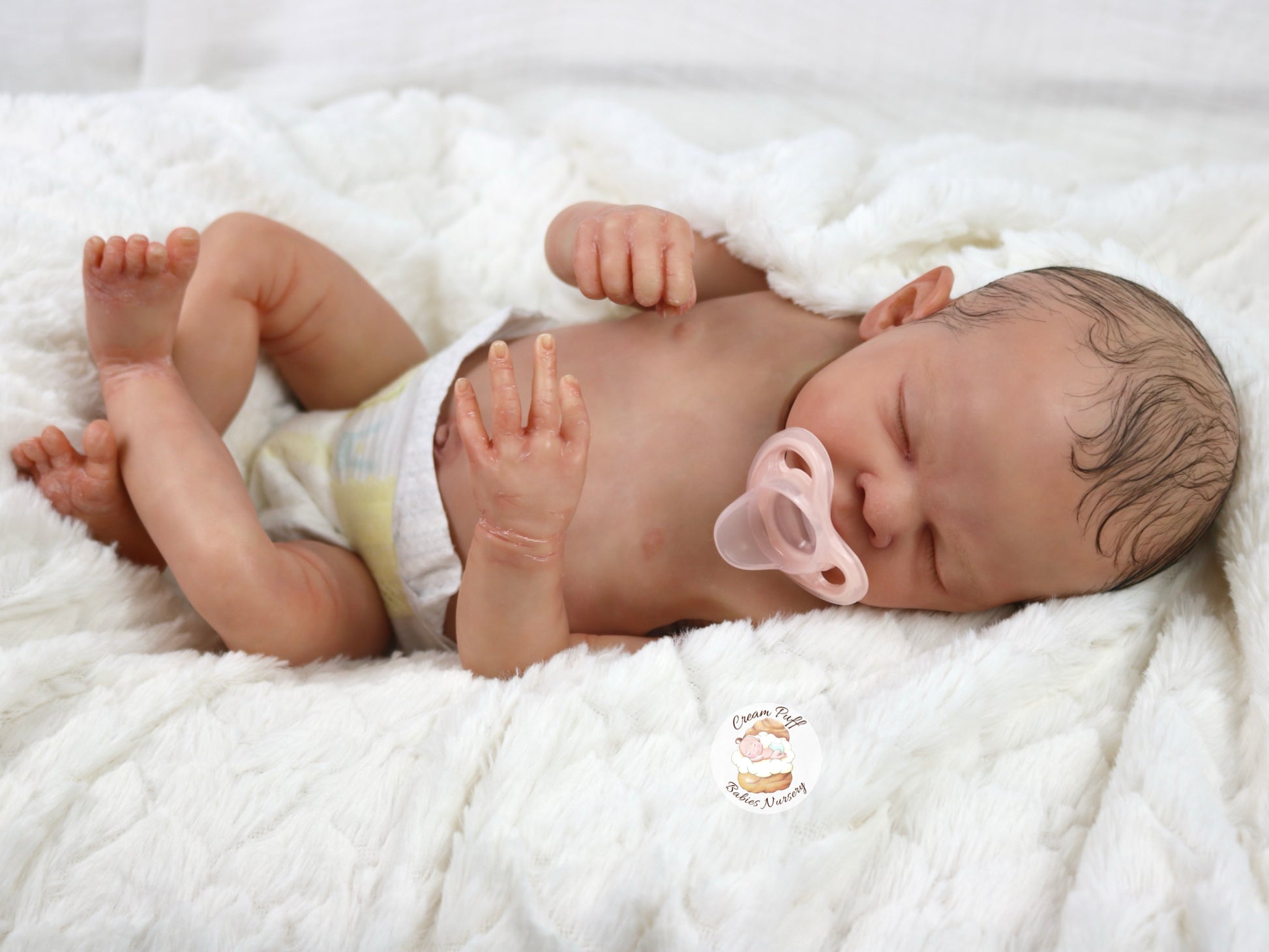 Meet sleepy baby Tyla, a sweet and realistic reborn baby, lovingly created from the rare and sold-out “Toby” kit by Cassie Brace / Cassie Ann Love.