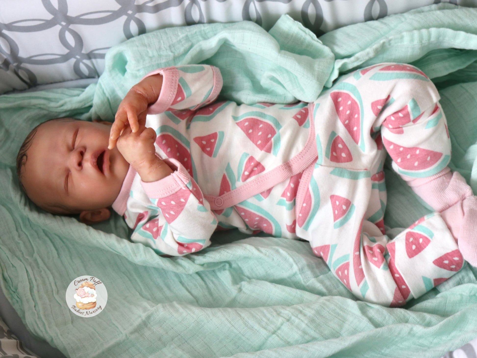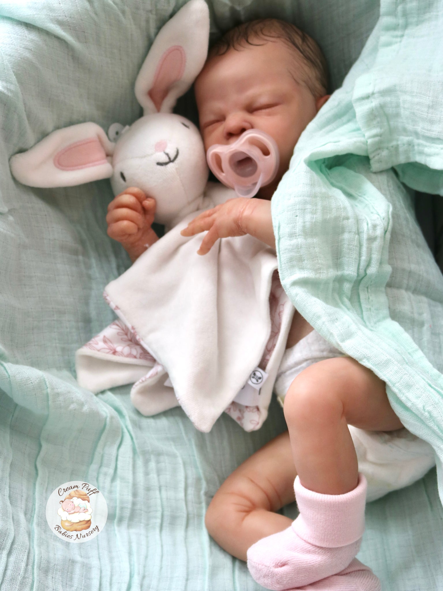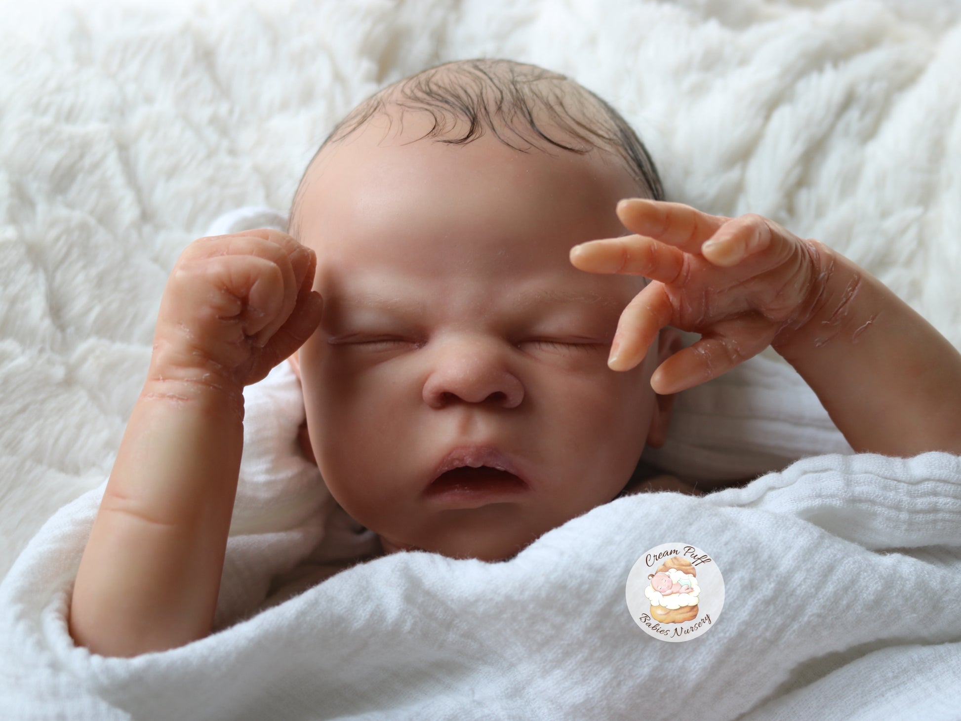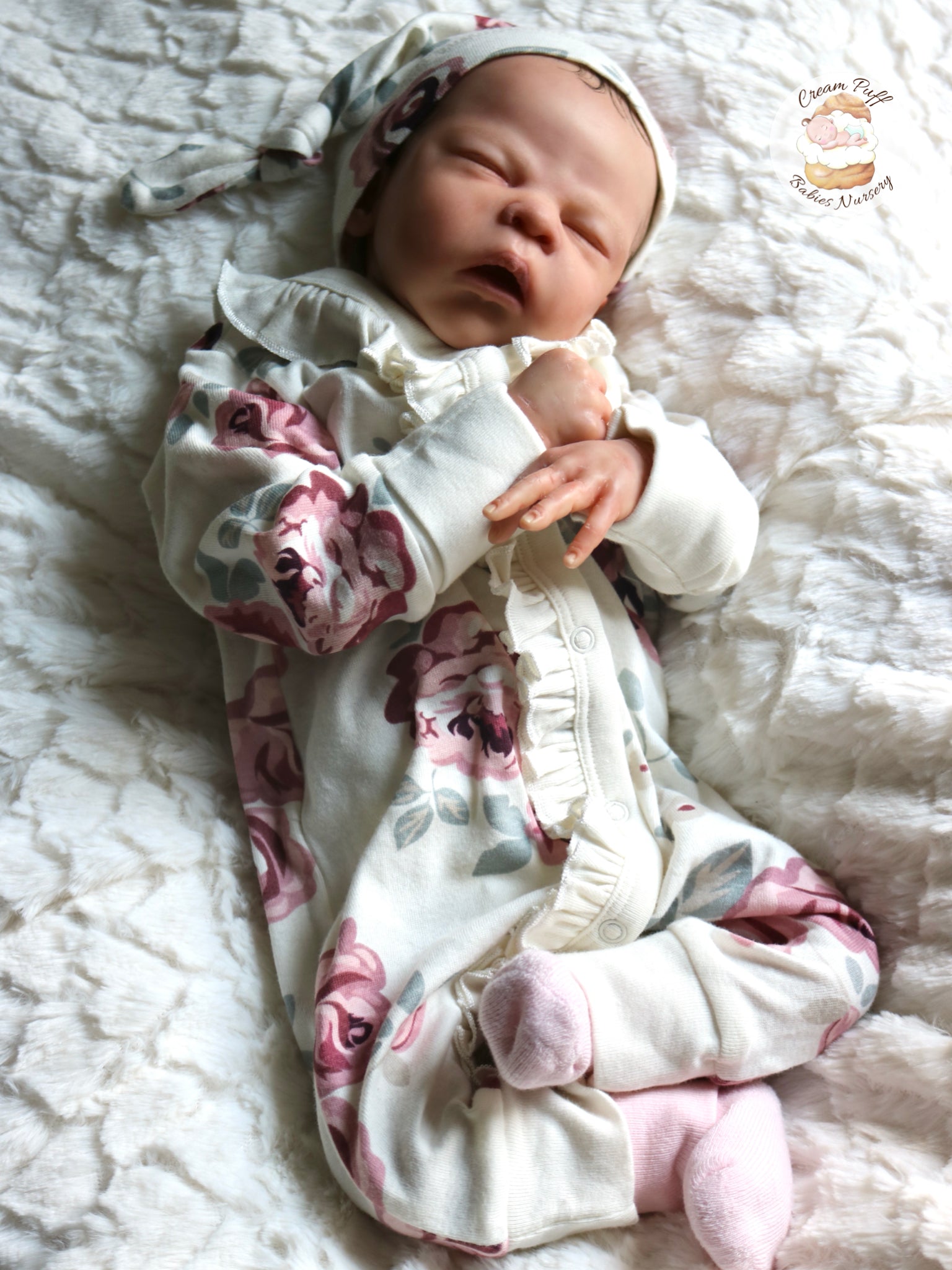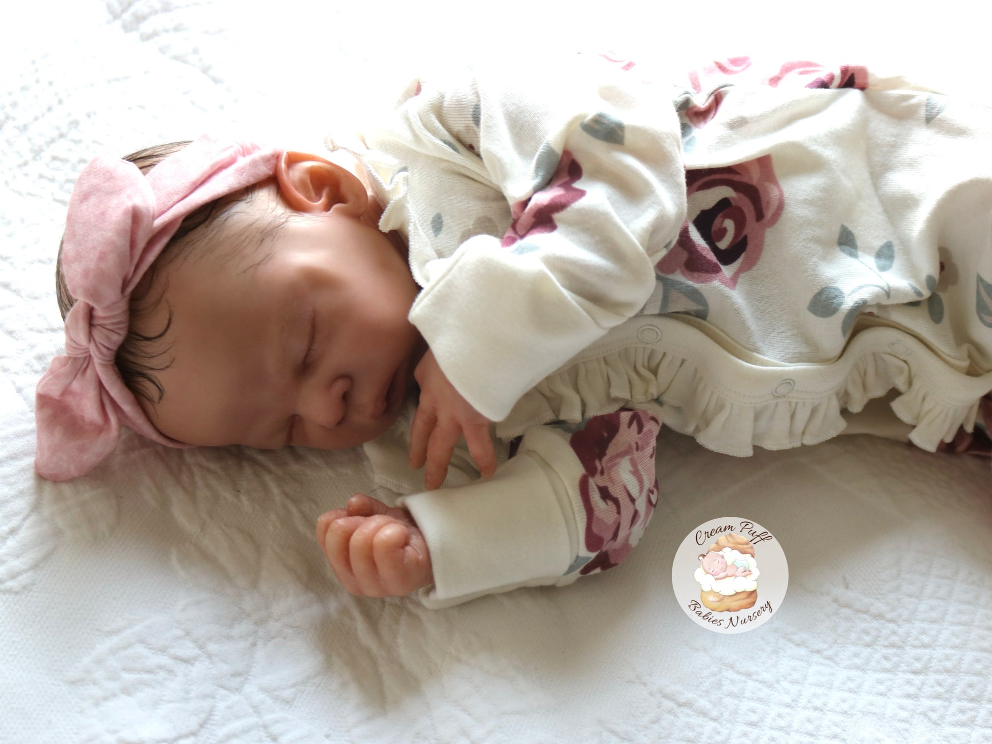 Meet sleepy baby Tyla, a sweet and realistic reborn baby, lovingly created from the rare and sold-out “Toby” kit by Cassie Brace / Cassie Ann Love.