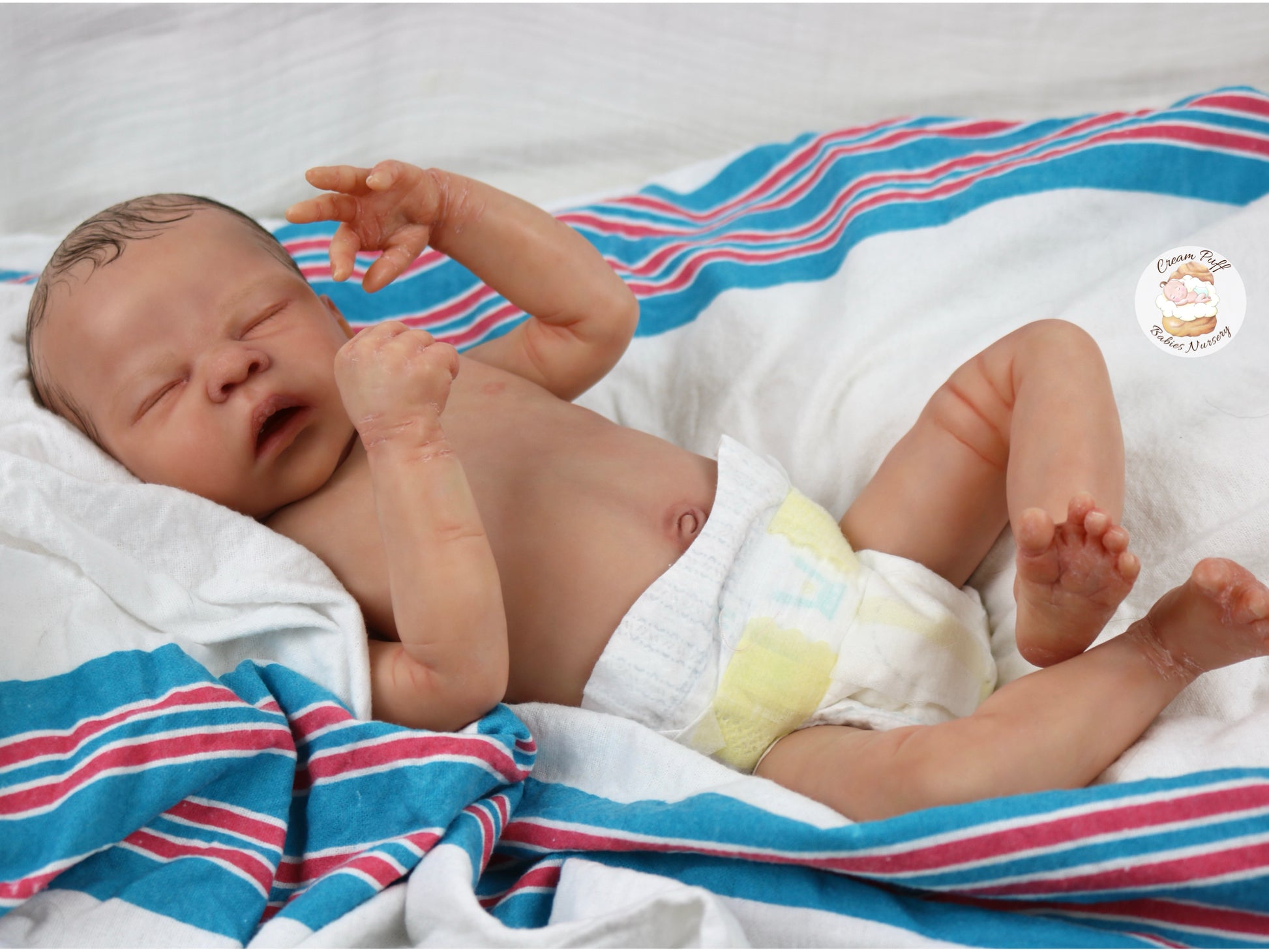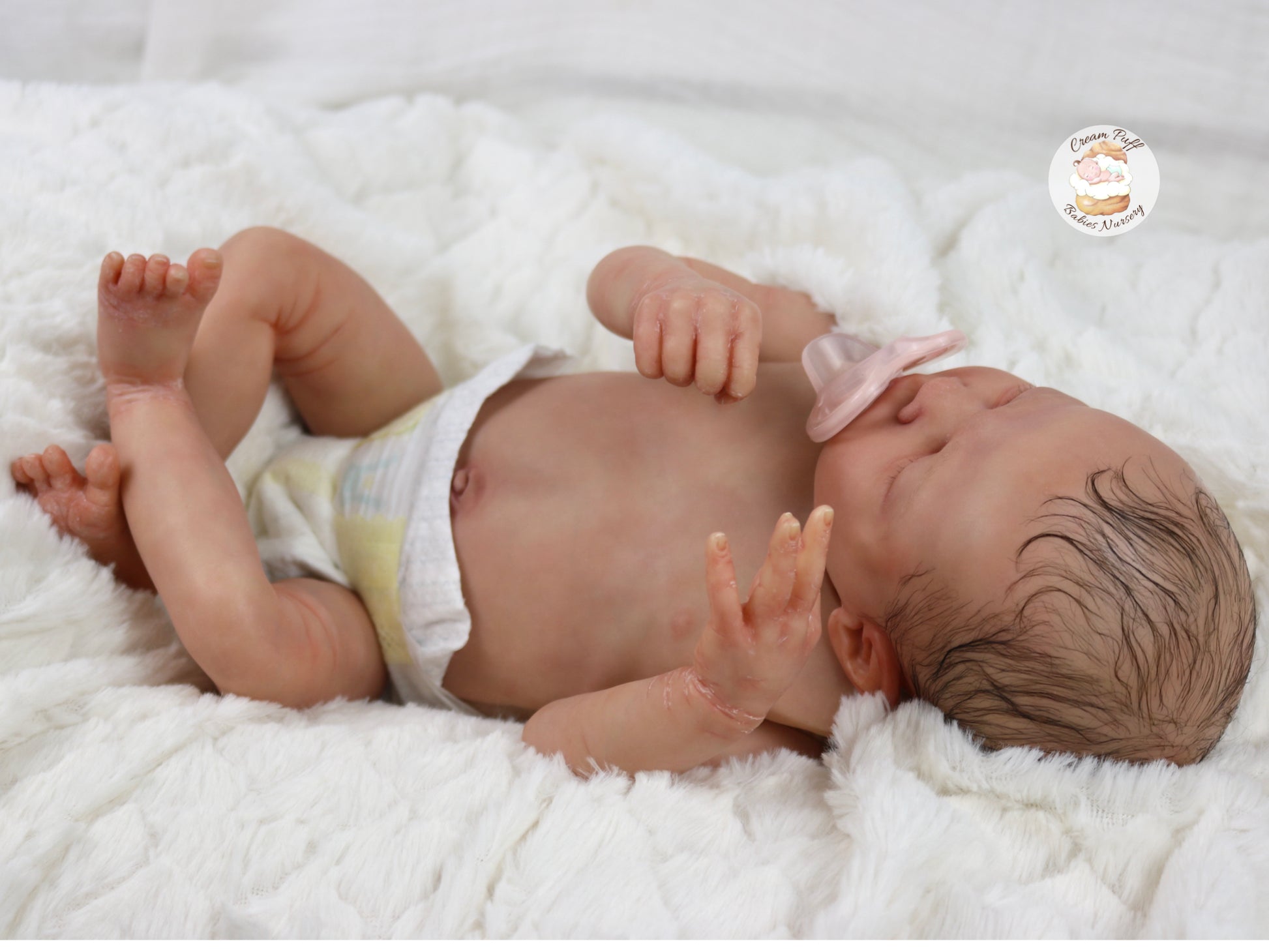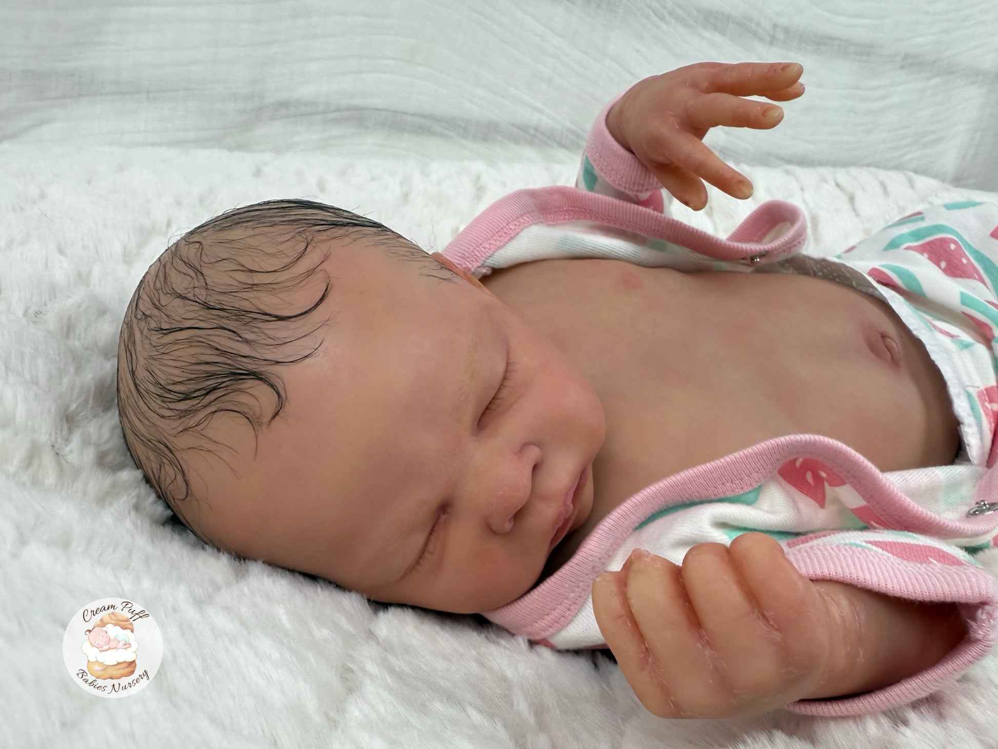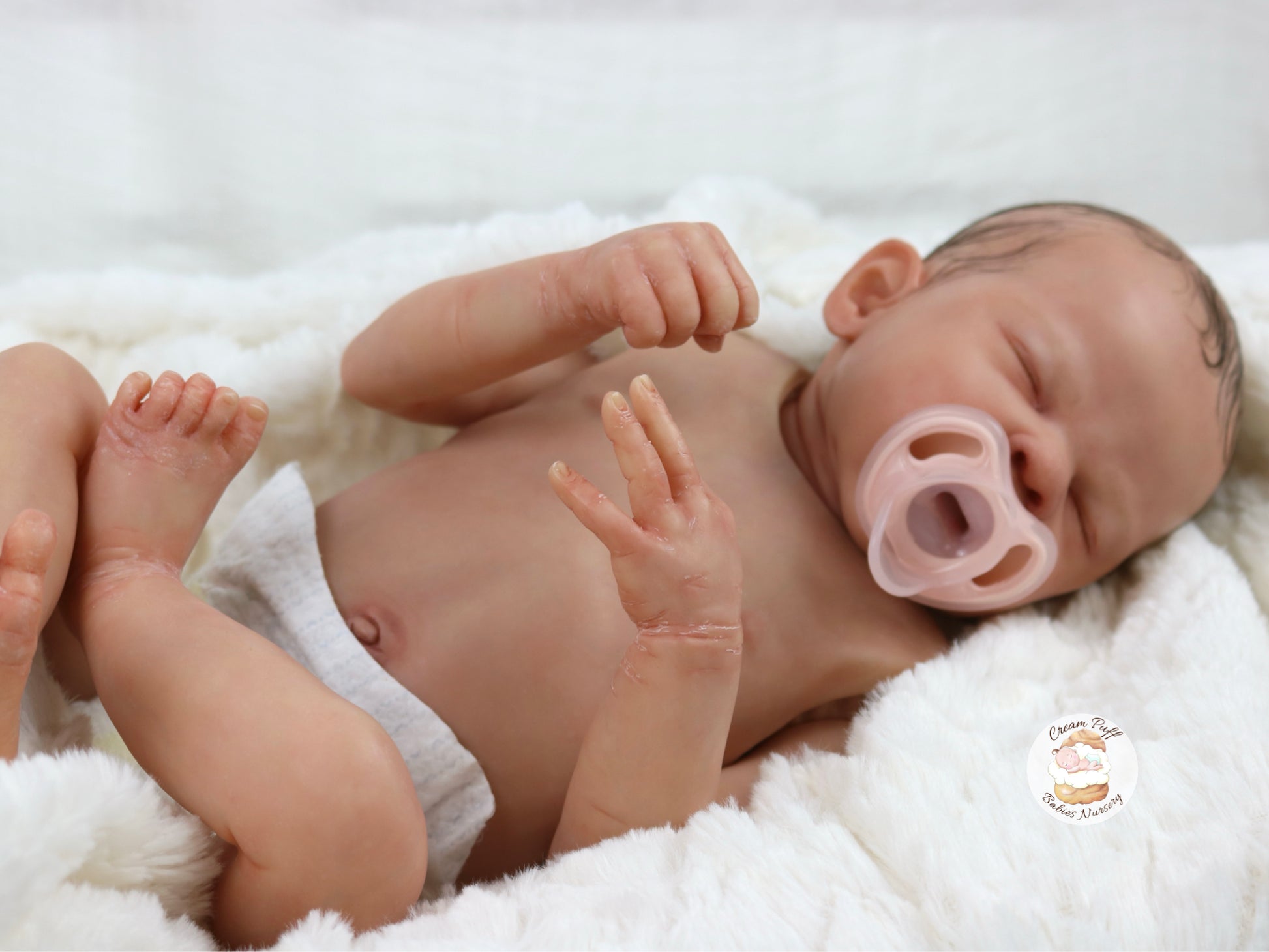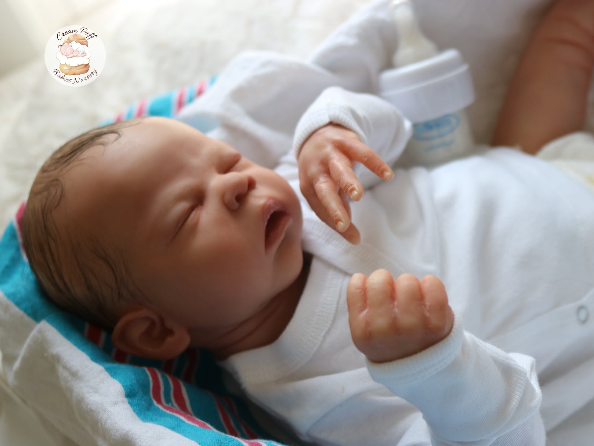Meet sleepy baby Tyla, a sweet and realistic reborn baby, lovingly created from the rare and sold-out “Toby” kit by Cassie Brace / Cassie Ann Love.