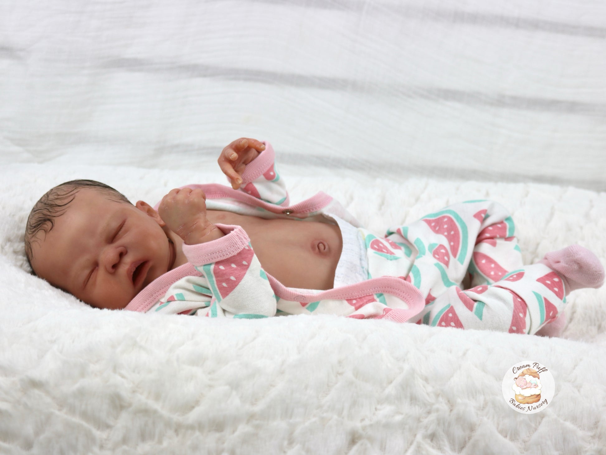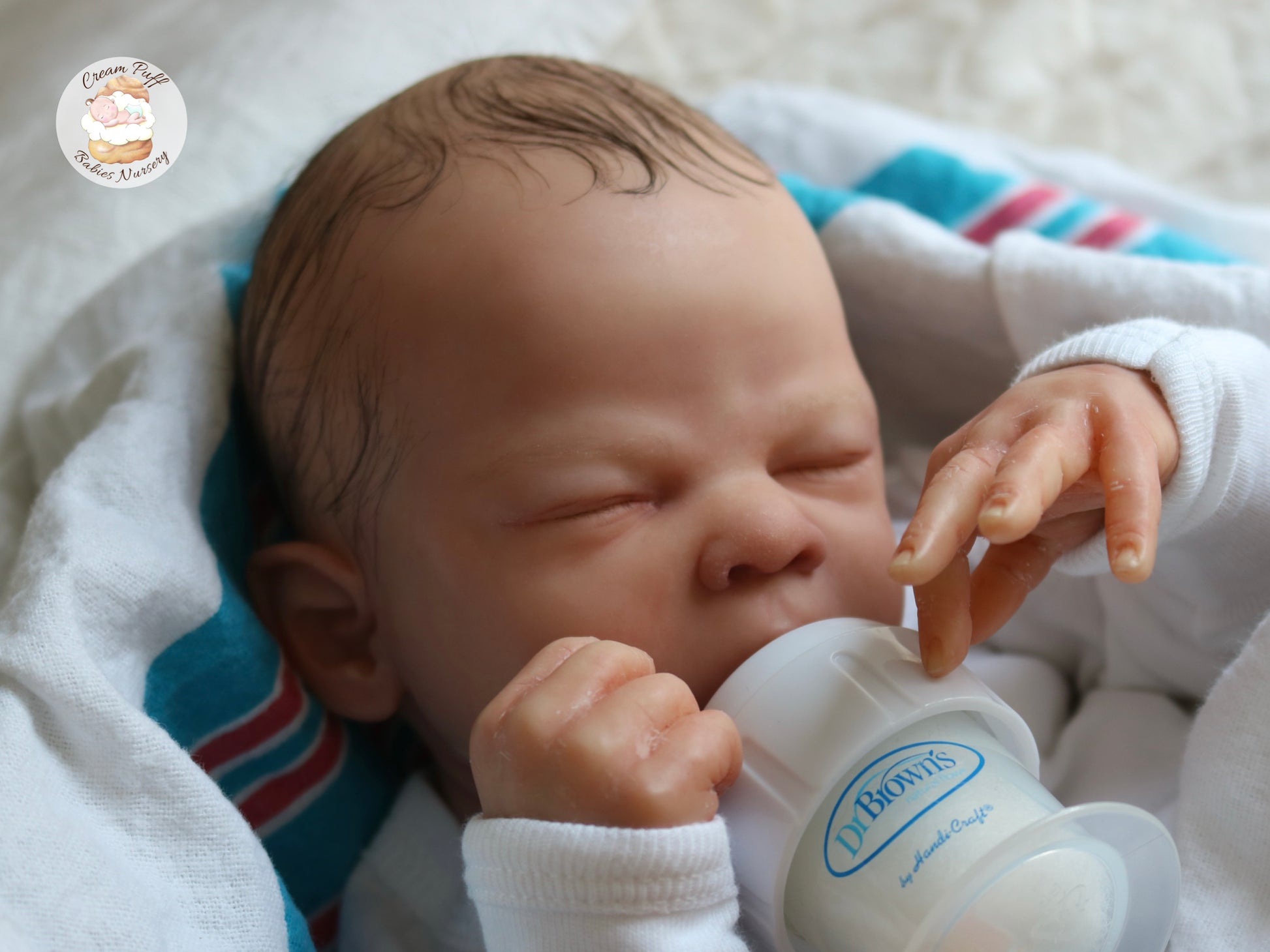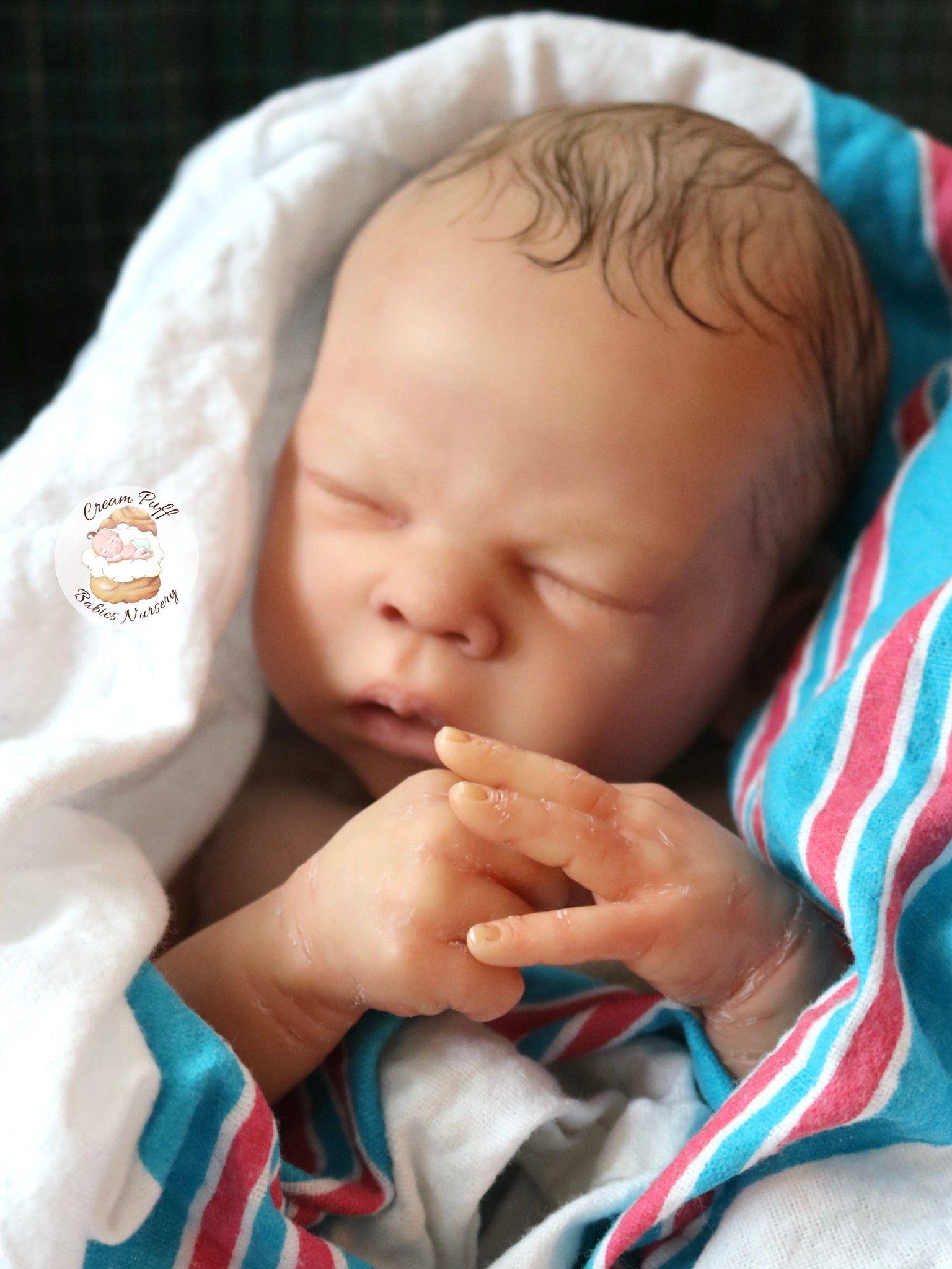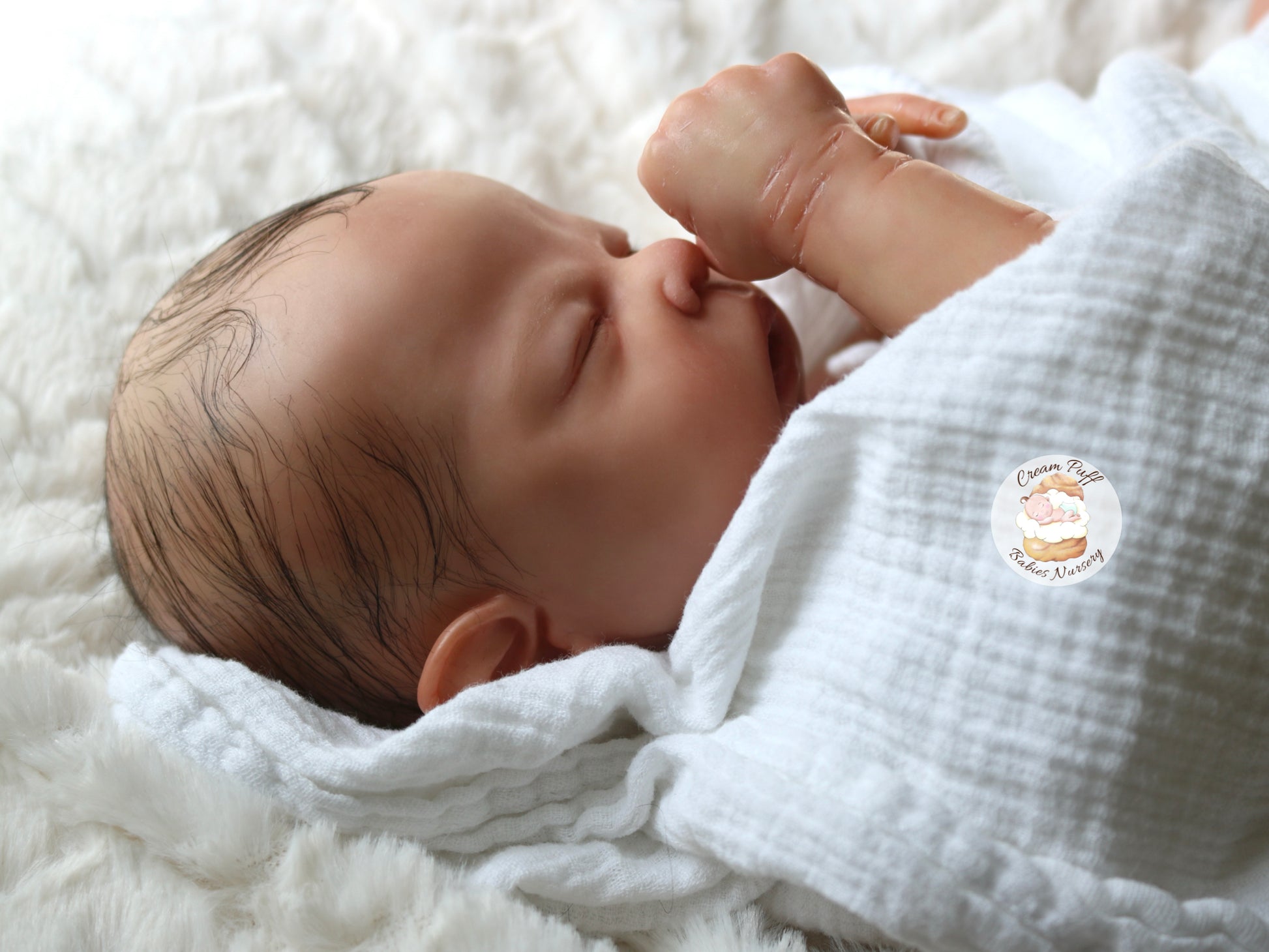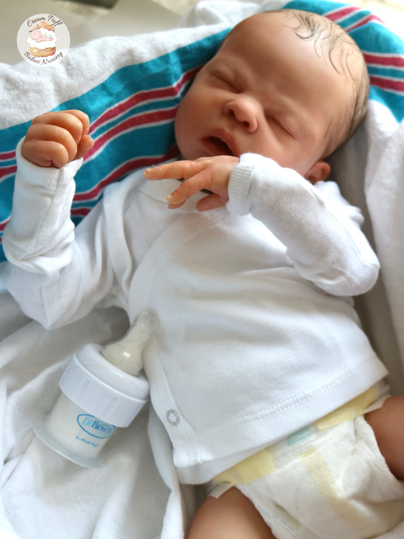 Meet sleepy baby Tyla, a sweet and realistic reborn baby, lovingly created from the rare and sold-out “Toby” kit by Cassie Brace / Cassie Ann Love.