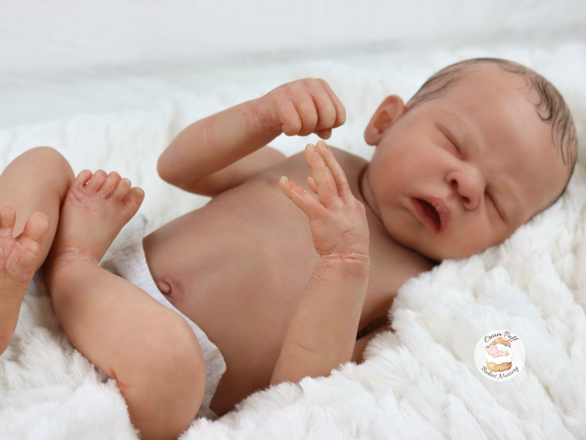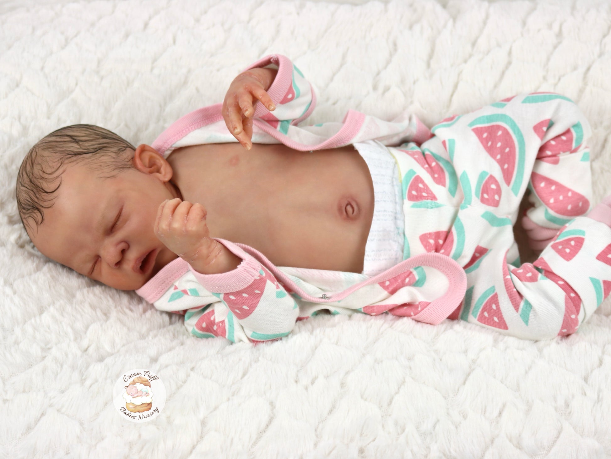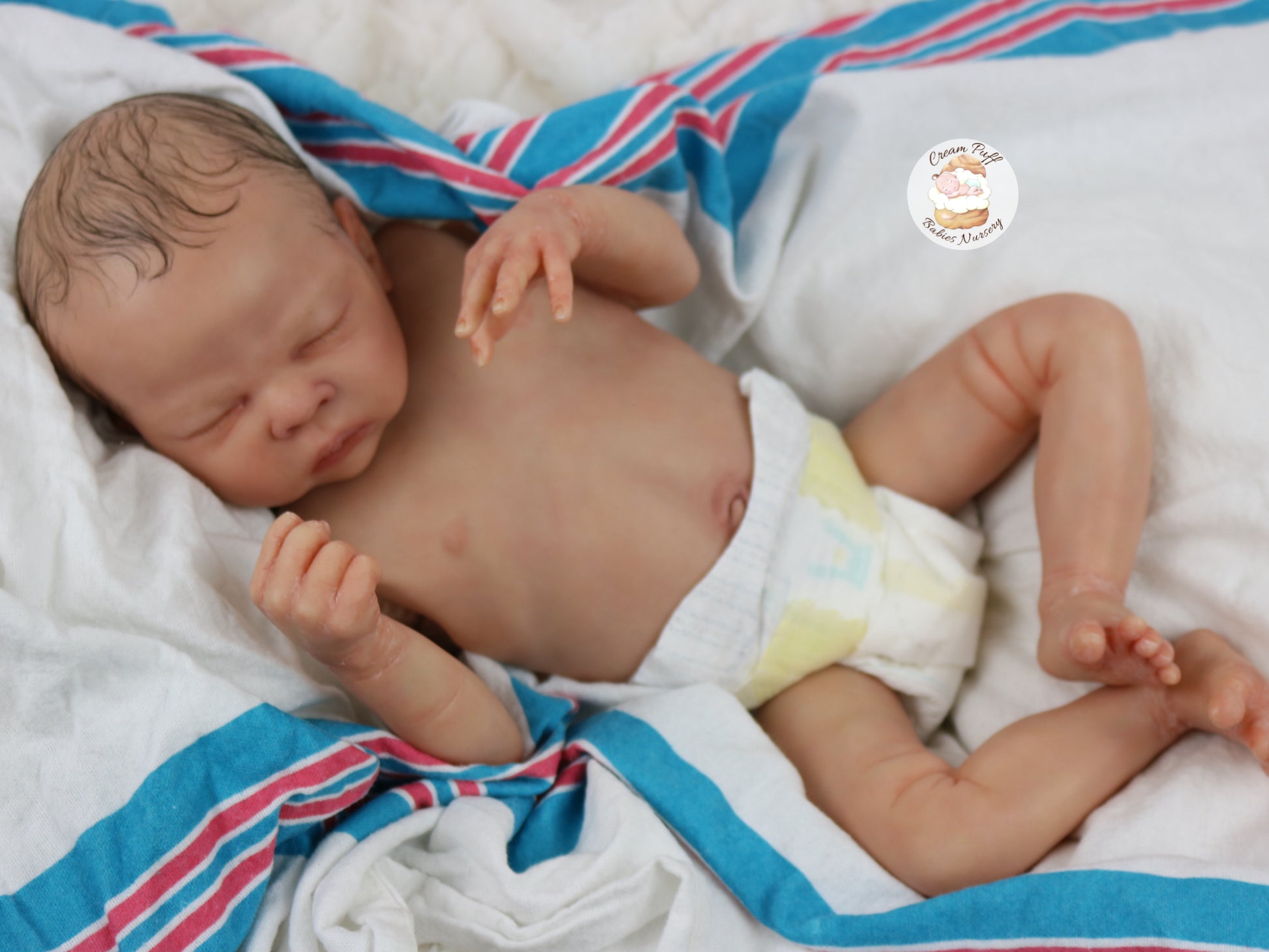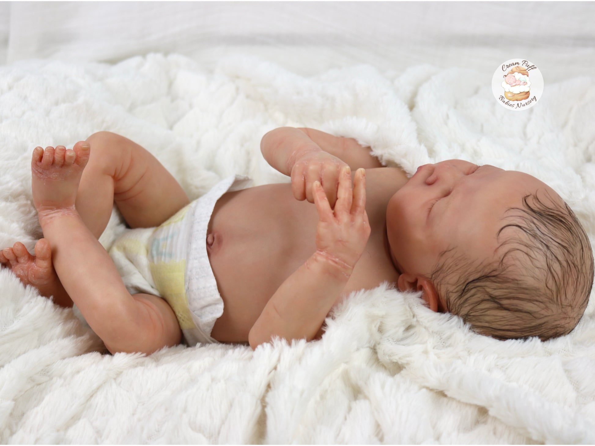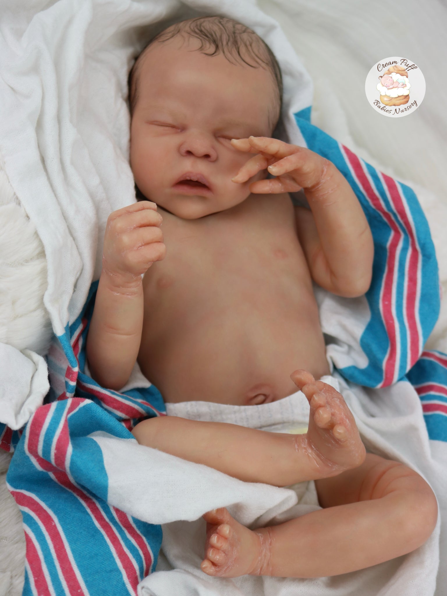 Meet sleepy baby Tyla, a sweet and realistic reborn baby, lovingly created from the rare and sold-out “Toby” kit by Cassie Brace / Cassie Ann Love.