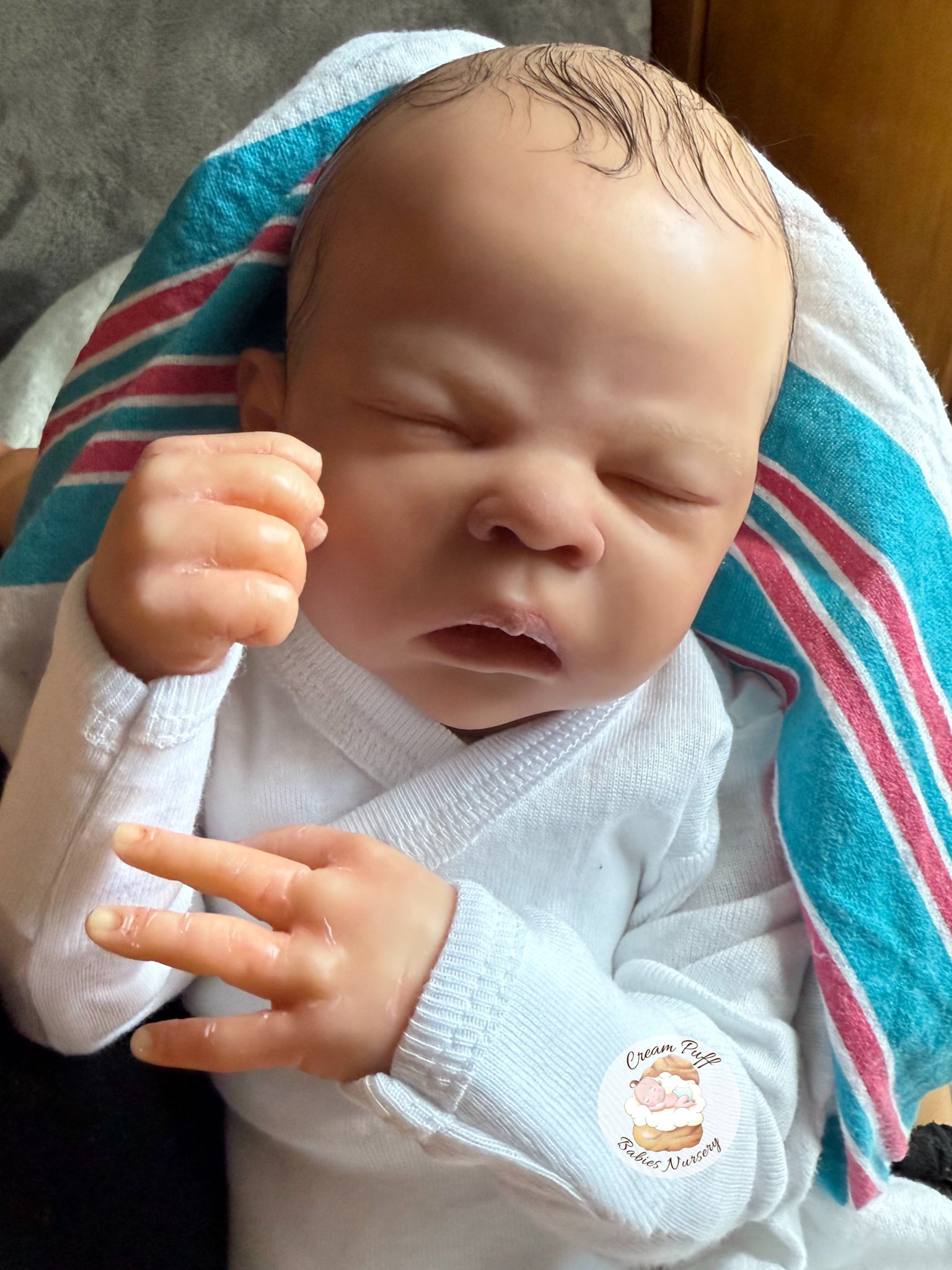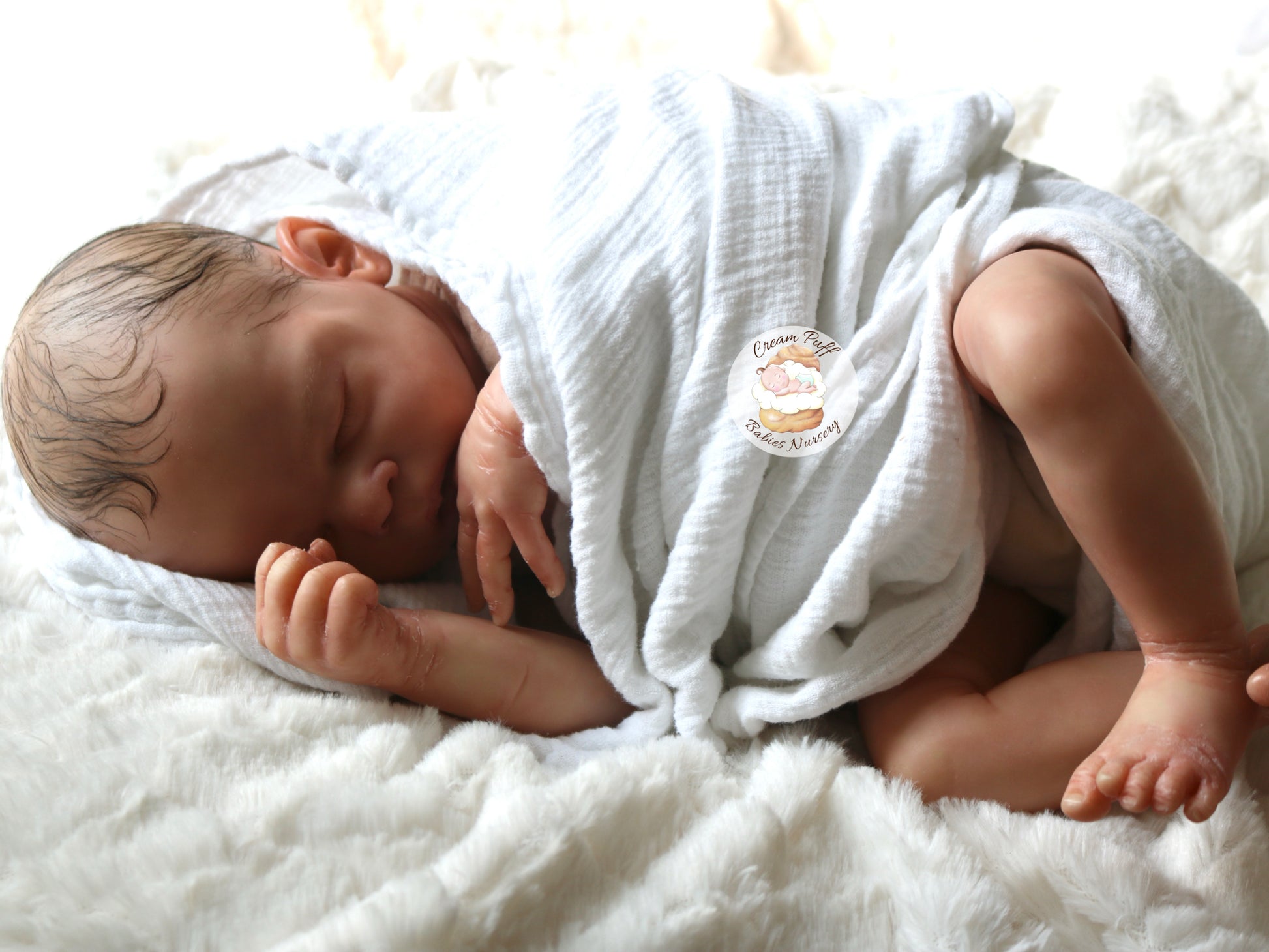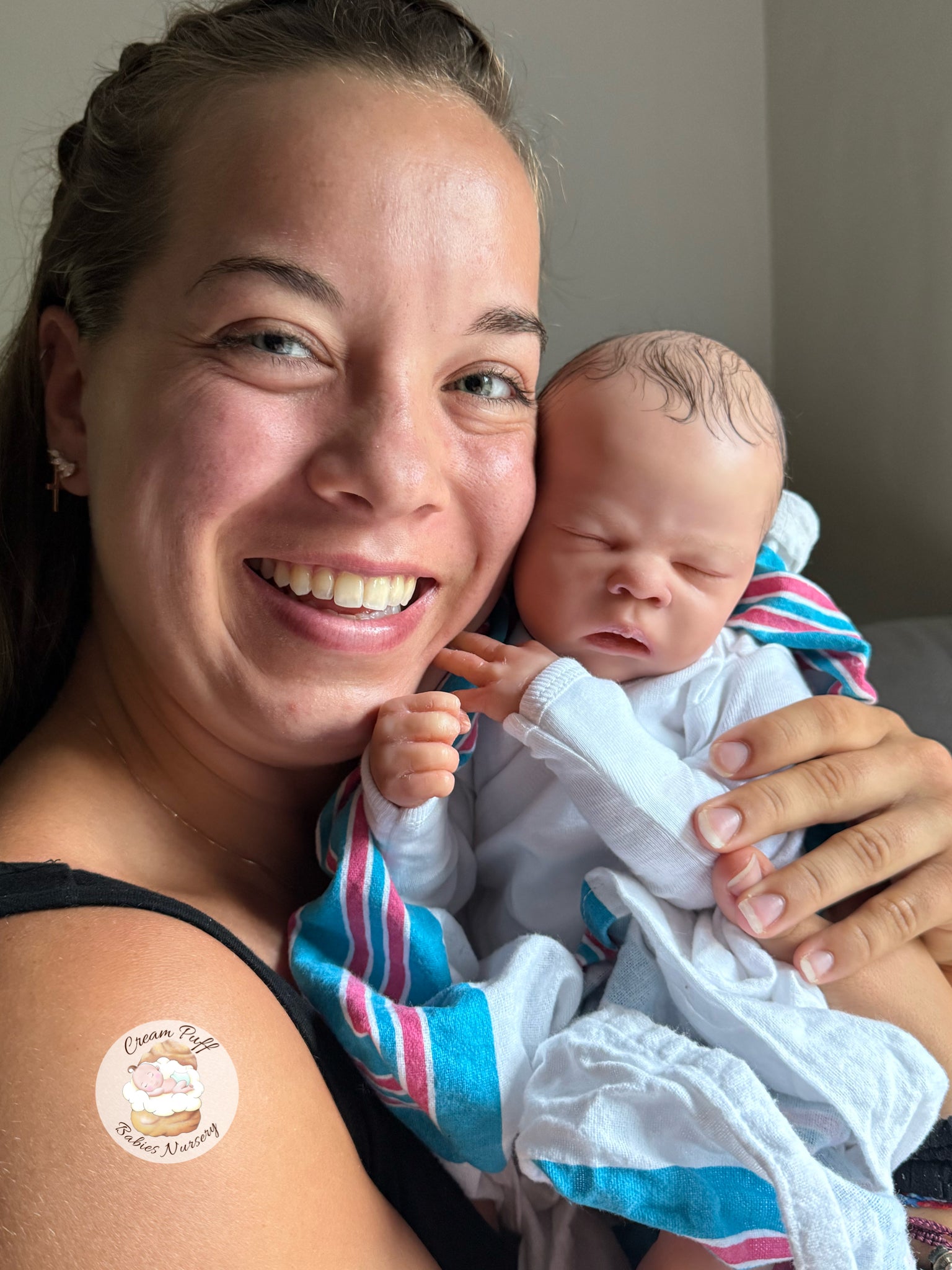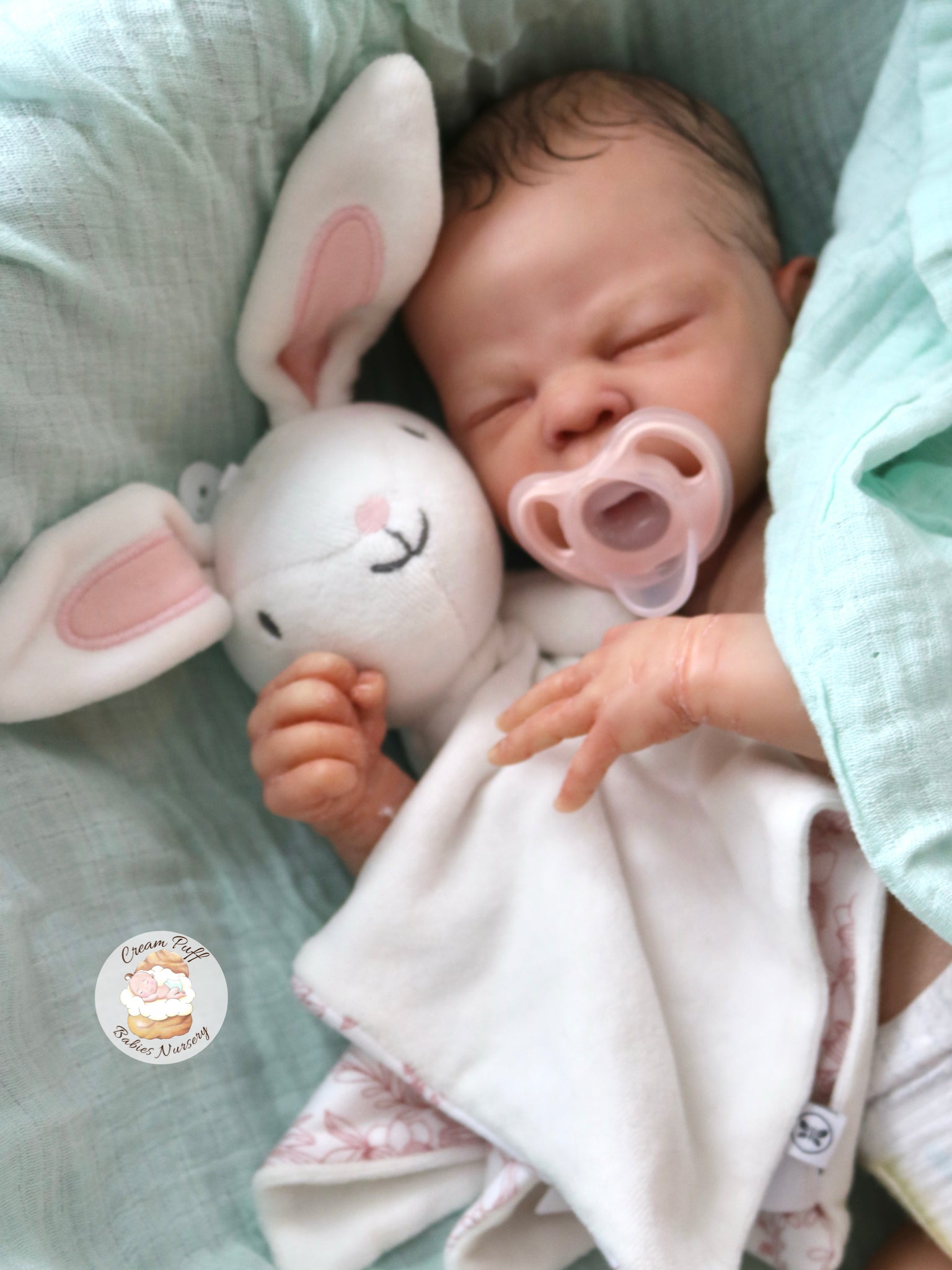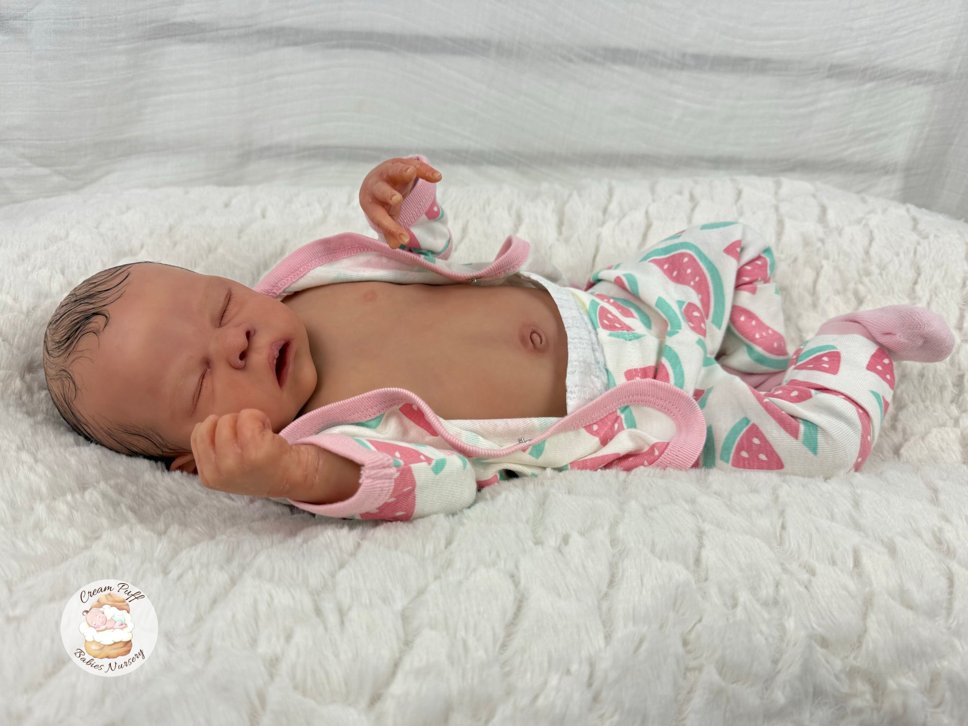 Meet sleepy baby Tyla, a sweet and realistic reborn baby, lovingly created from the rare and sold-out “Toby” kit by Cassie Brace / Cassie Ann Love.