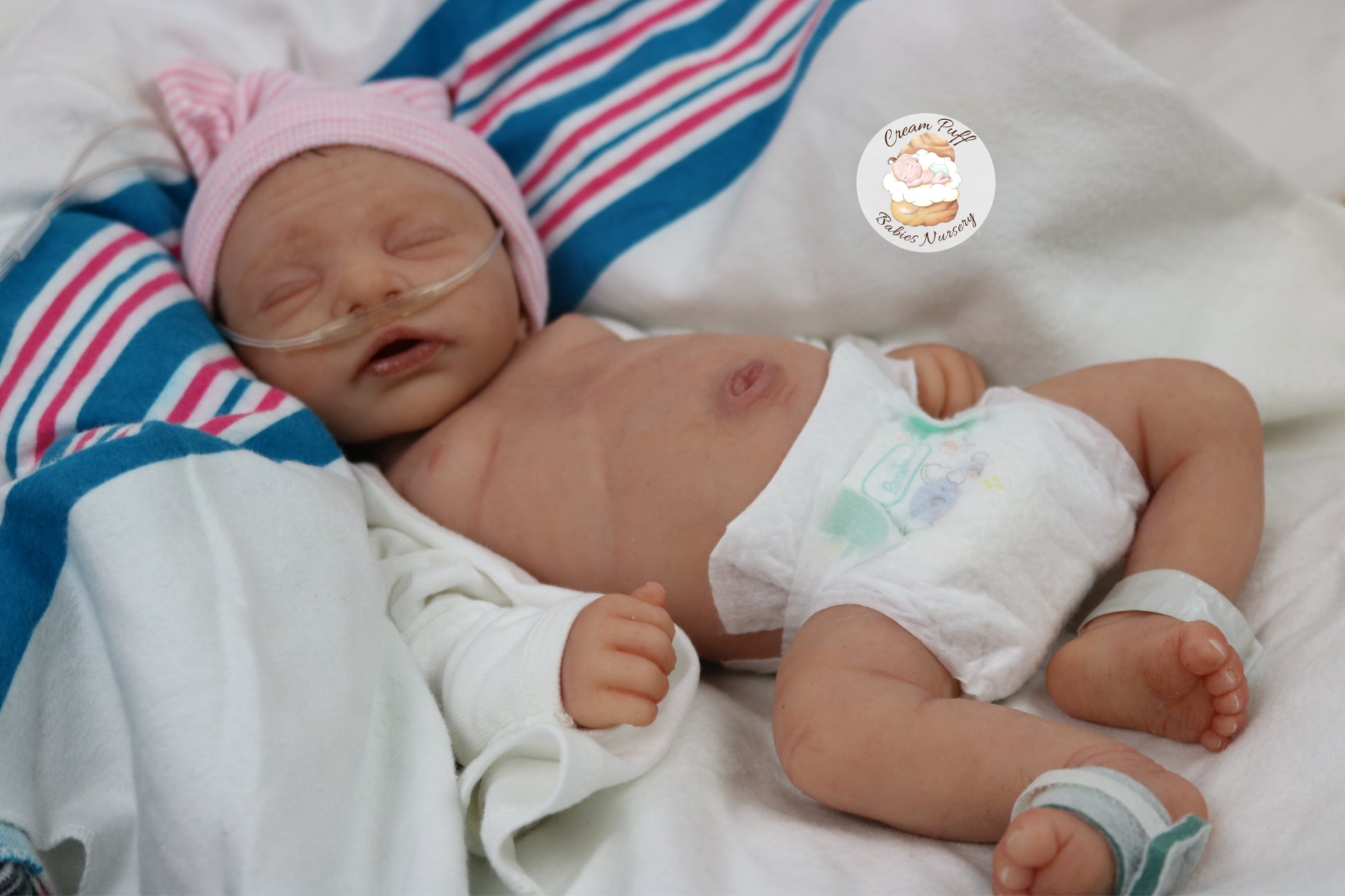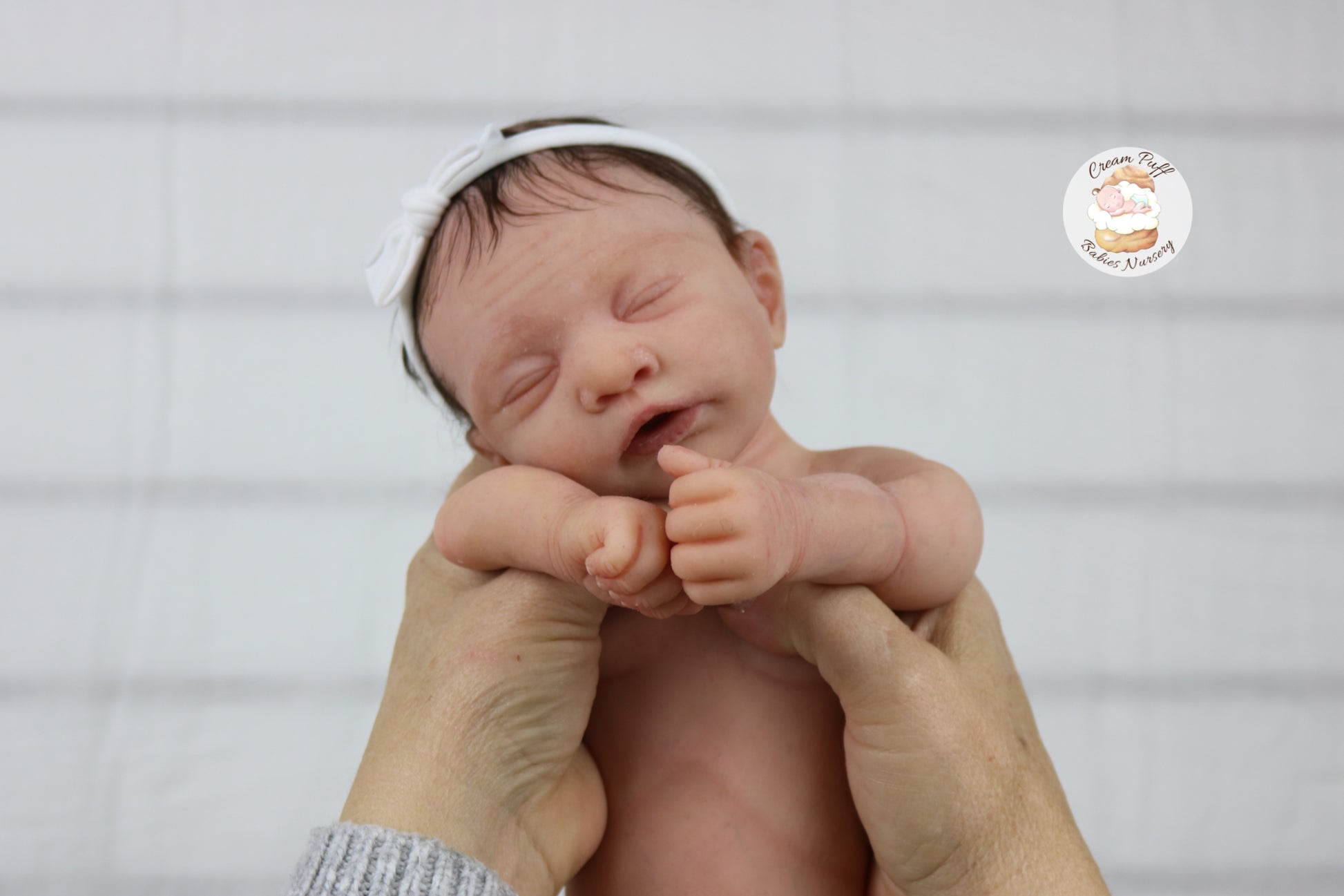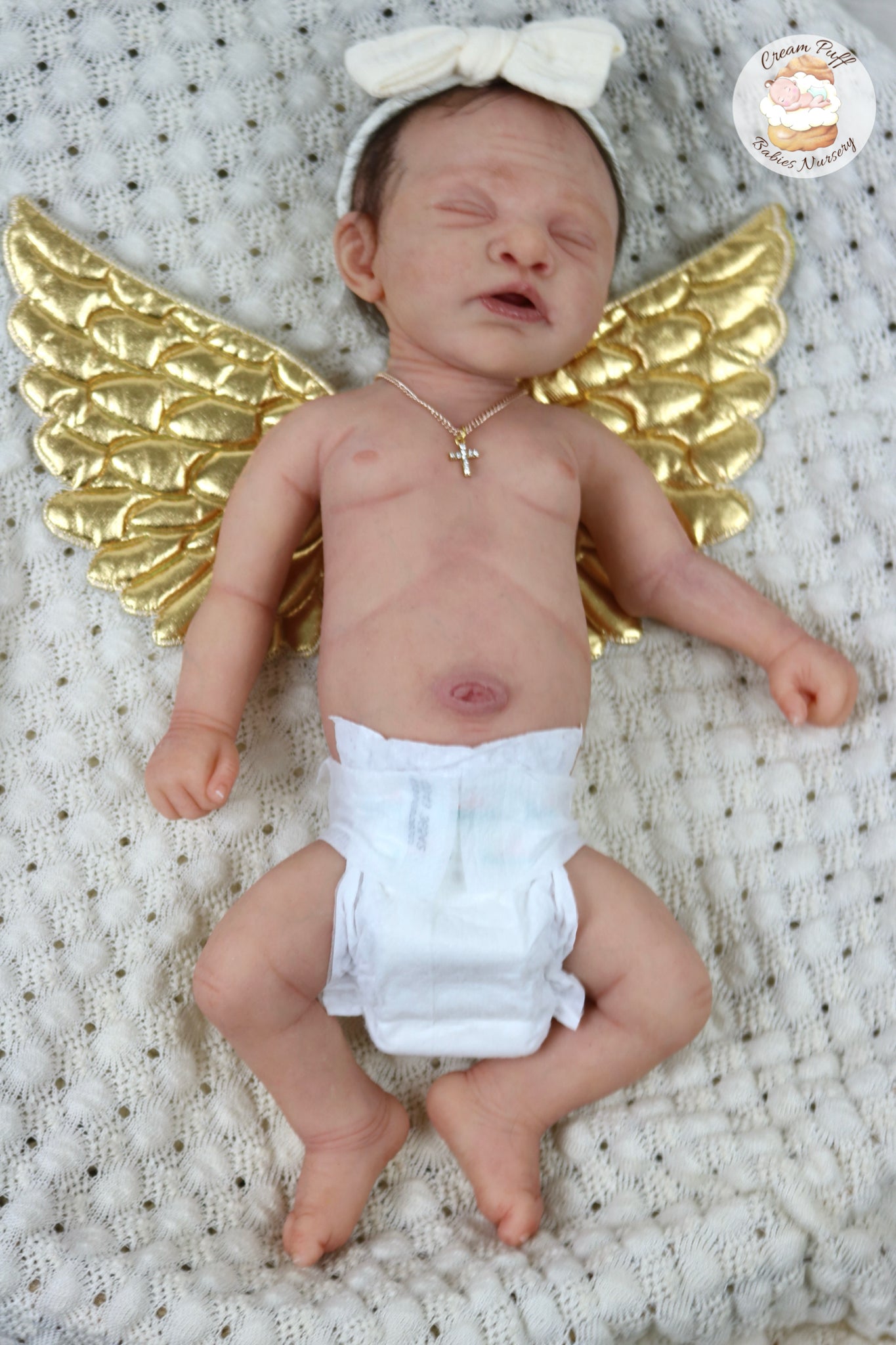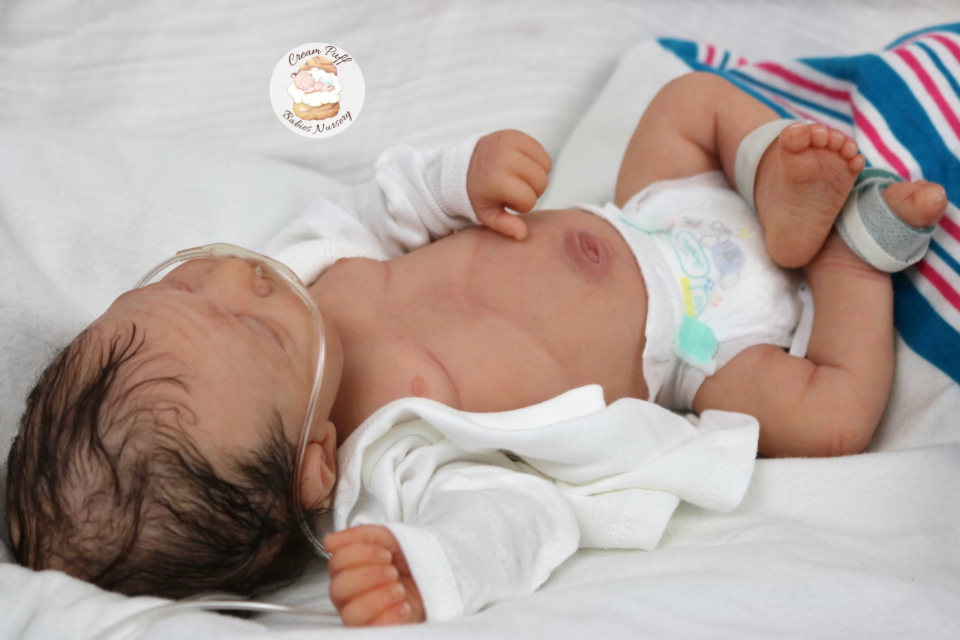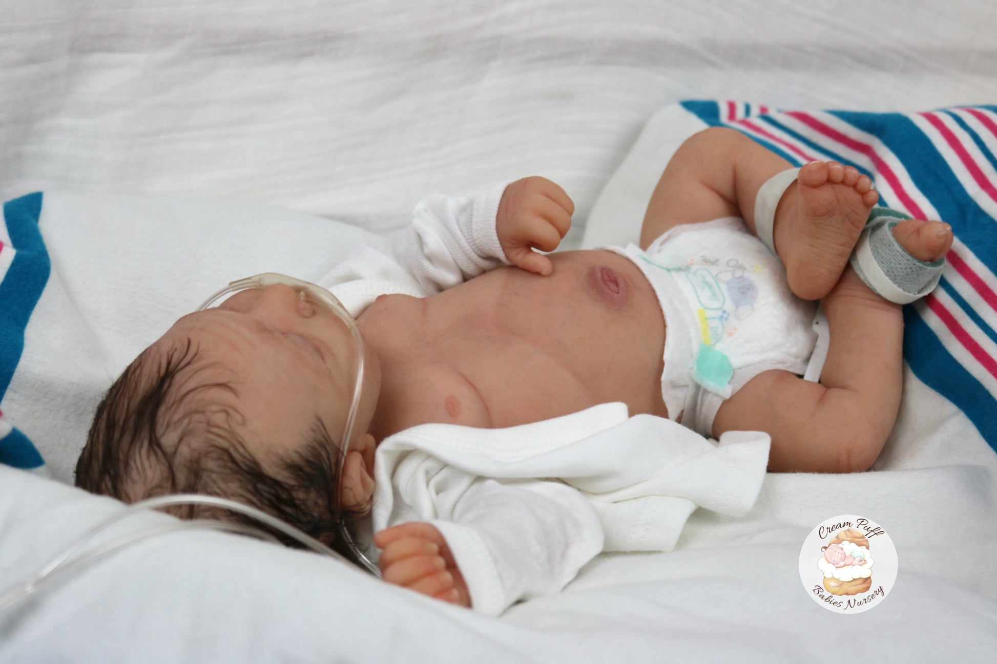 She is a limited edition full body silicone sleeping baby. Kairi was sculpted by very talented Elena Westbrook. Kairi is made out of high quality super soft blend Eco-Flex 20 platinum silicone and was produced by Maria Lynn Dolls. The sculpt to start out with was a blank neutral pale skin tone silicone and was put through our reborn process to enhance her premature realism and lifelike 3D skin depth newborn look. The solid silicone allows her body to feel weighted and move like a baby of her size would. I wanted to make Kairi as life like as possible and used various painting techniques to add layers of depth within the skin tone to highlight all of her detailed features. This natural shade of coloring was created by using various shades of silicone pigments which I've applied over multiple layers to achieve the depth of detail and true to life look I envisioned. She was then sealed with a high quality matte finish. I handled her delicately, and spent extra time and care creating, enhancing, and developing her realistic features.