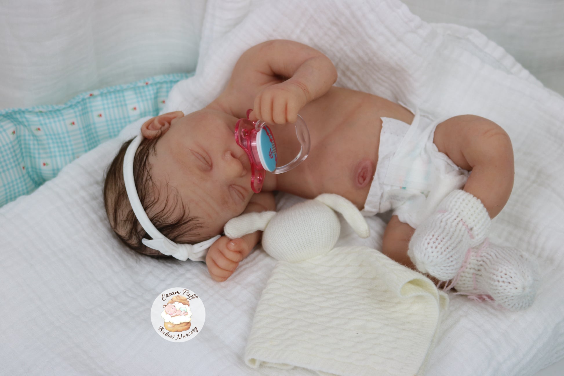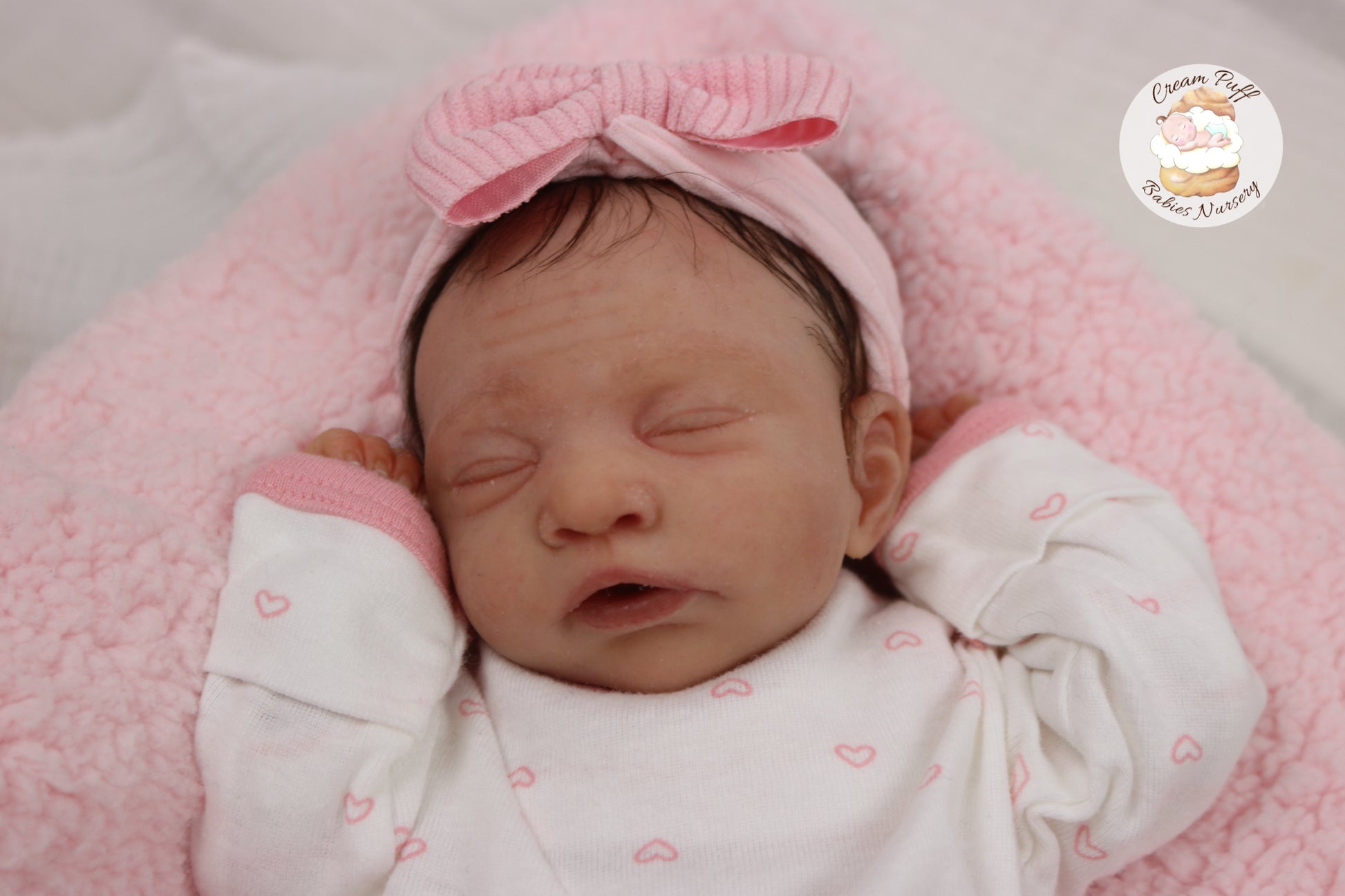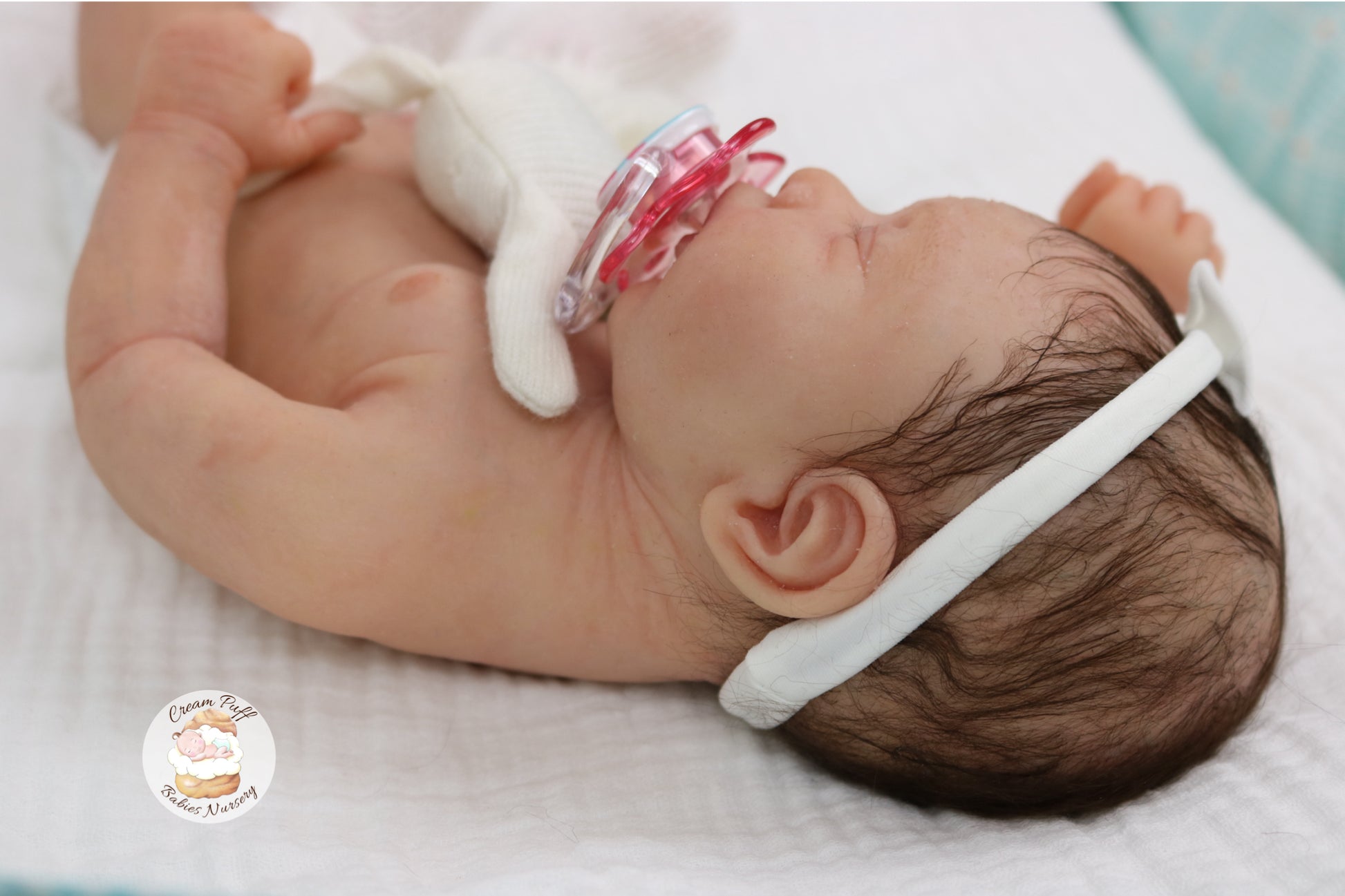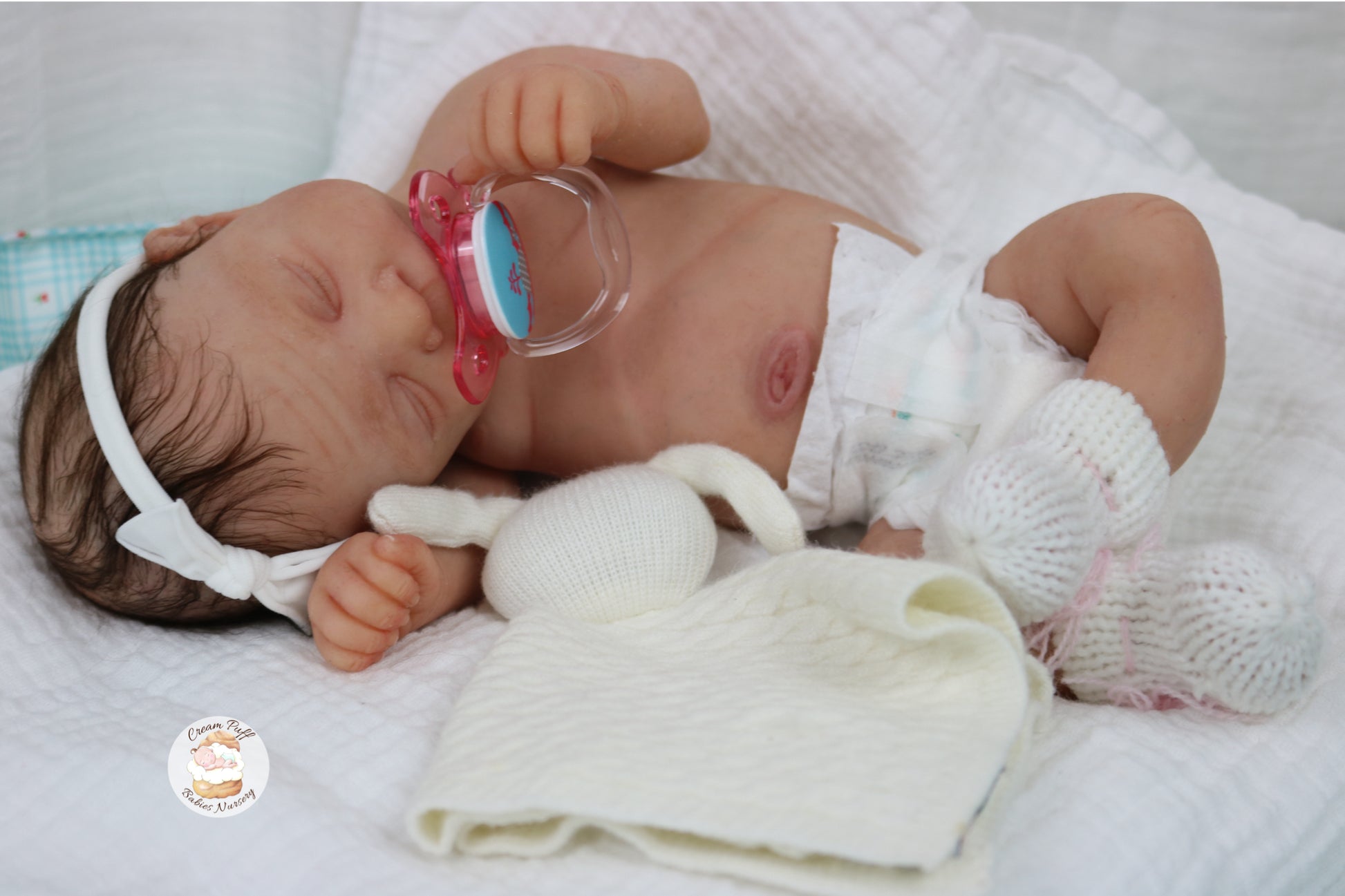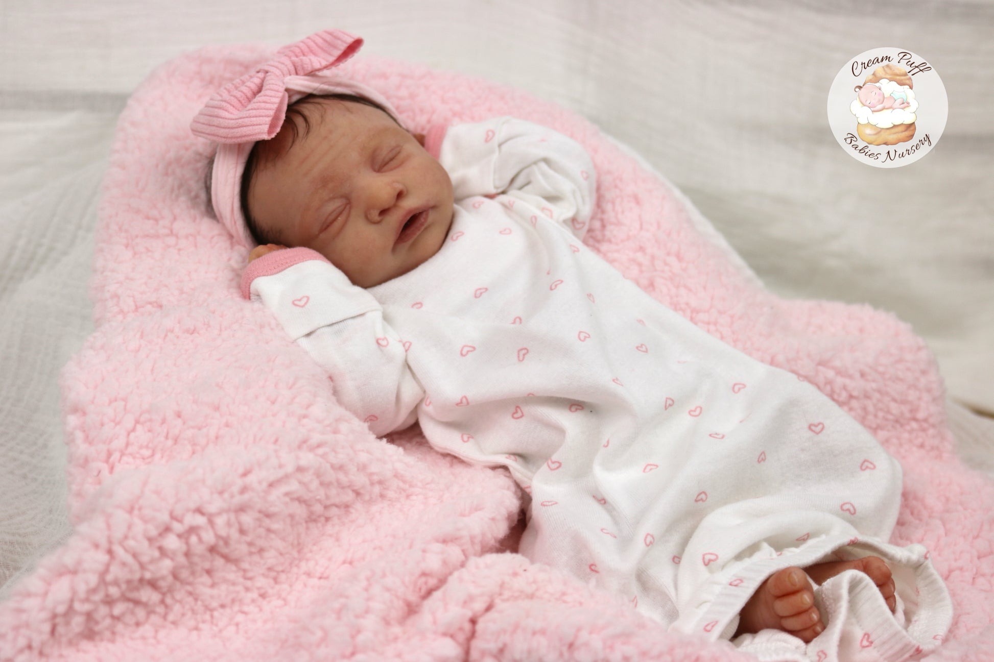 She is a limited edition full body silicone sleeping baby. Kairi was sculpted by very talented Elena Westbrook. Kairi is made out of high quality super soft blend Eco-Flex 20 platinum silicone and was produced by Maria Lynn Dolls. The sculpt to start out with was a blank neutral pale skin tone silicone and was put through our reborn process to enhance her premature realism and lifelike 3D skin depth newborn look. The solid silicone allows her body to feel weighted and move like a baby of her size would. I wanted to make Kairi as life like as possible and used various painting techniques to add layers of depth within the skin tone to highlight all of her detailed features. This natural shade of coloring was created by using various shades of silicone pigments which I've applied over multiple layers to achieve the depth of detail and true to life look I envisioned. She was then sealed with a high quality matte finish. I handled her delicately, and spent extra time and care creating, enhancing, and developing her realistic features.