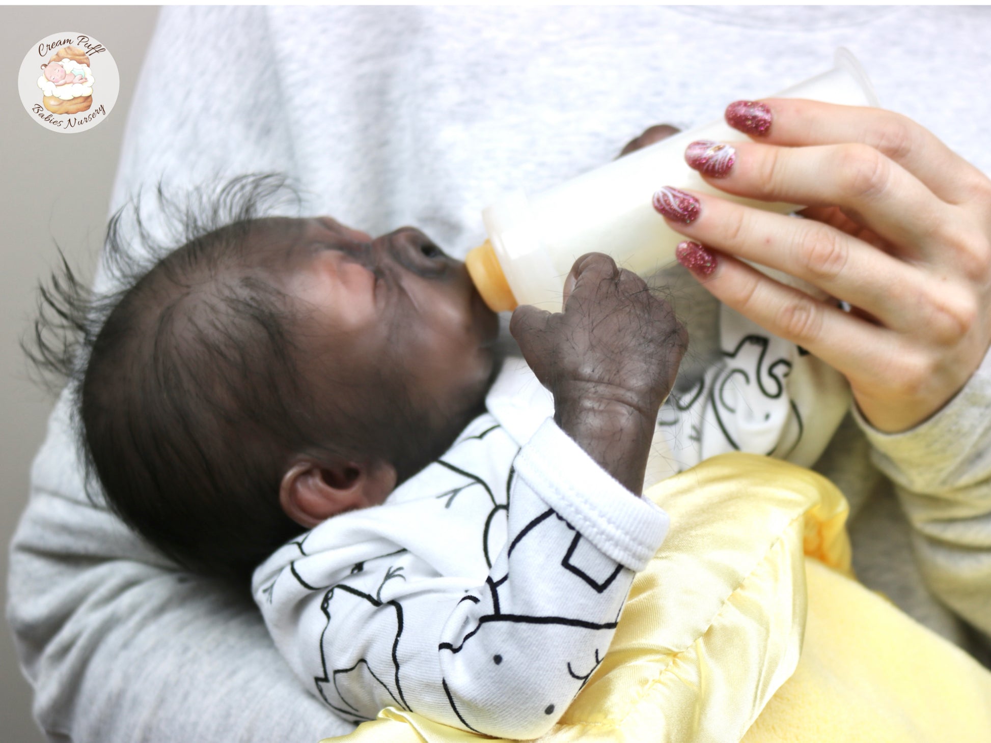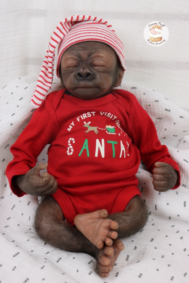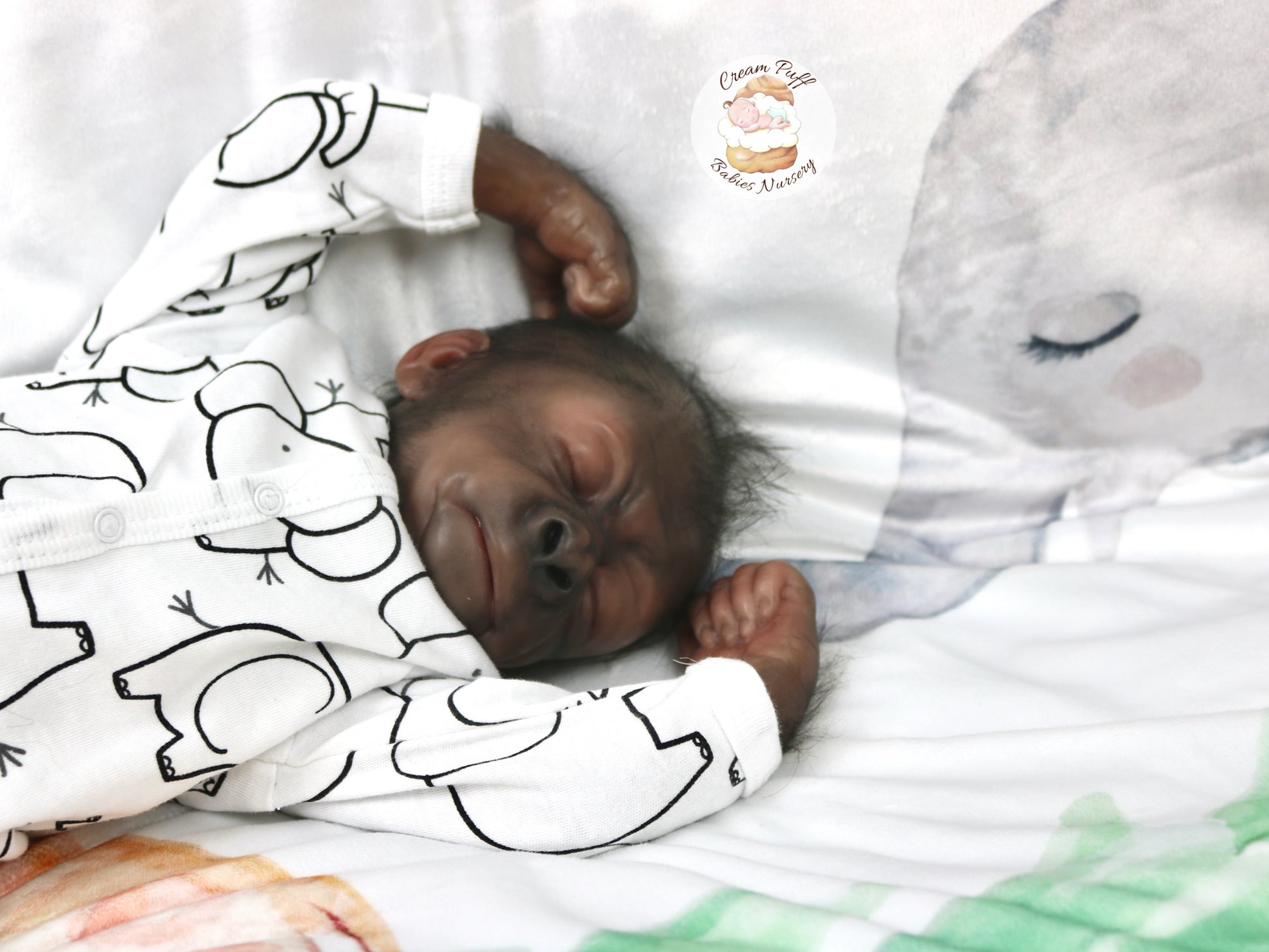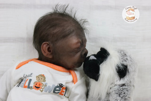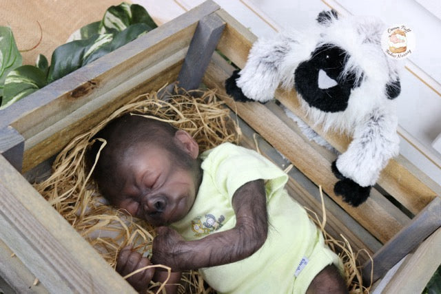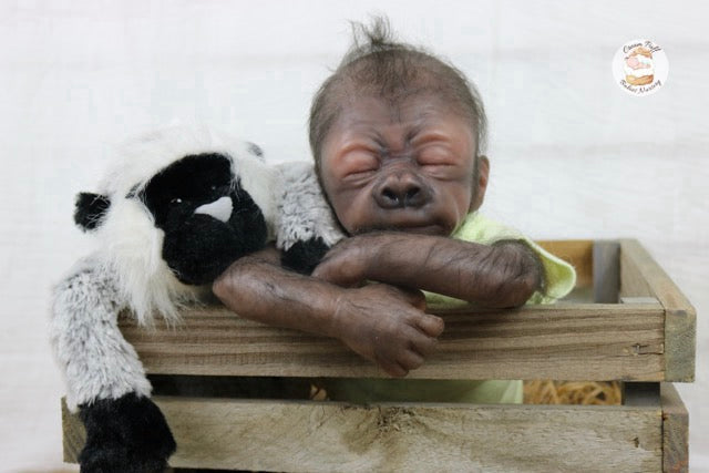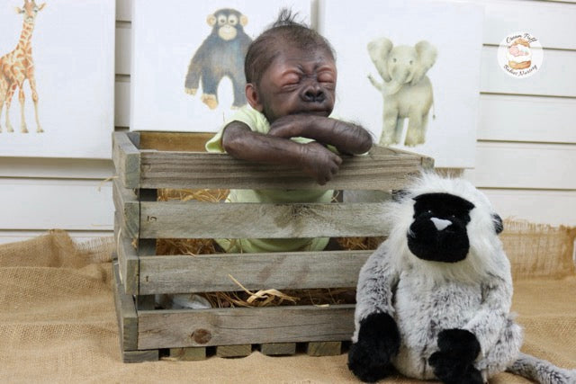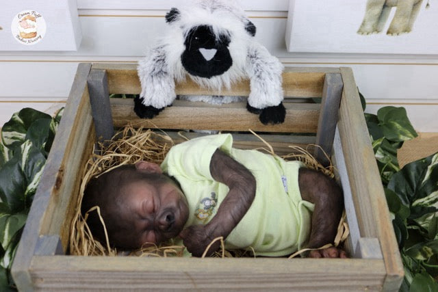 This precious sleeping, little gorilla came into the nursery as “Pearl" by Denise Pratt. The kit to start out with is very realistic and putting him through our reborn process enhances that even more.