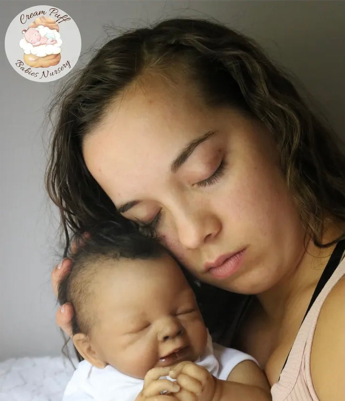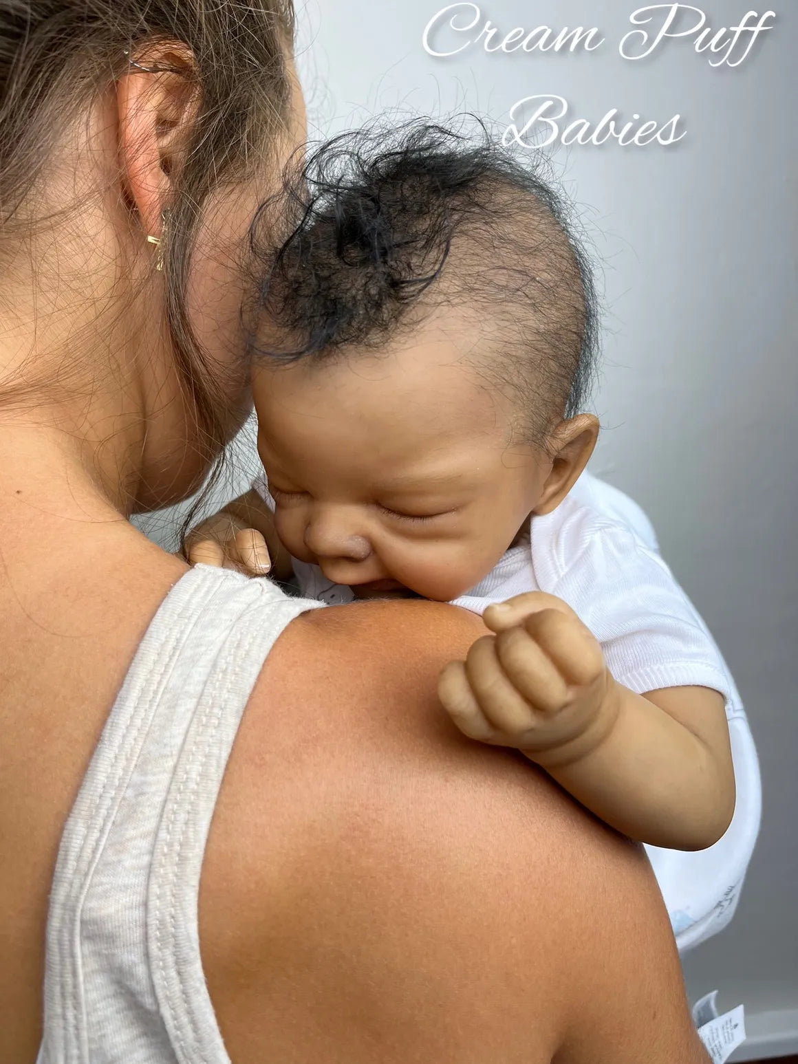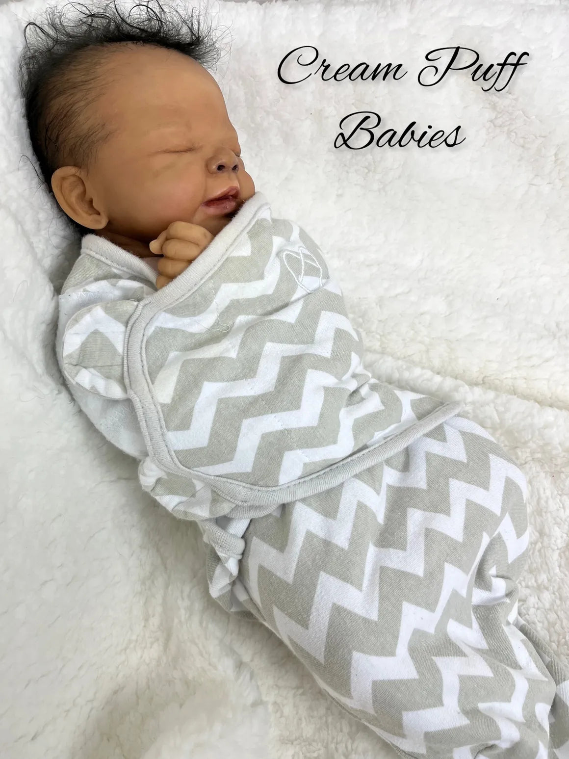 “As in real life, each baby's skin tone is unique. Multiple artistic techniques were used to achieve the desired biracial/ African American skin complexion for Gideon. The vinyl was colored on the outside to give the most realistic premature "blotchy" skin tones. This natural shade of coloring was created by using various shades of Genesis heat set paints, which I've applied over multiple layers to achieve the depth of detail and true to life look I envisioned. I handled him delicately, and spent extra time and care creating, enhancing, and developing his realistic features.“