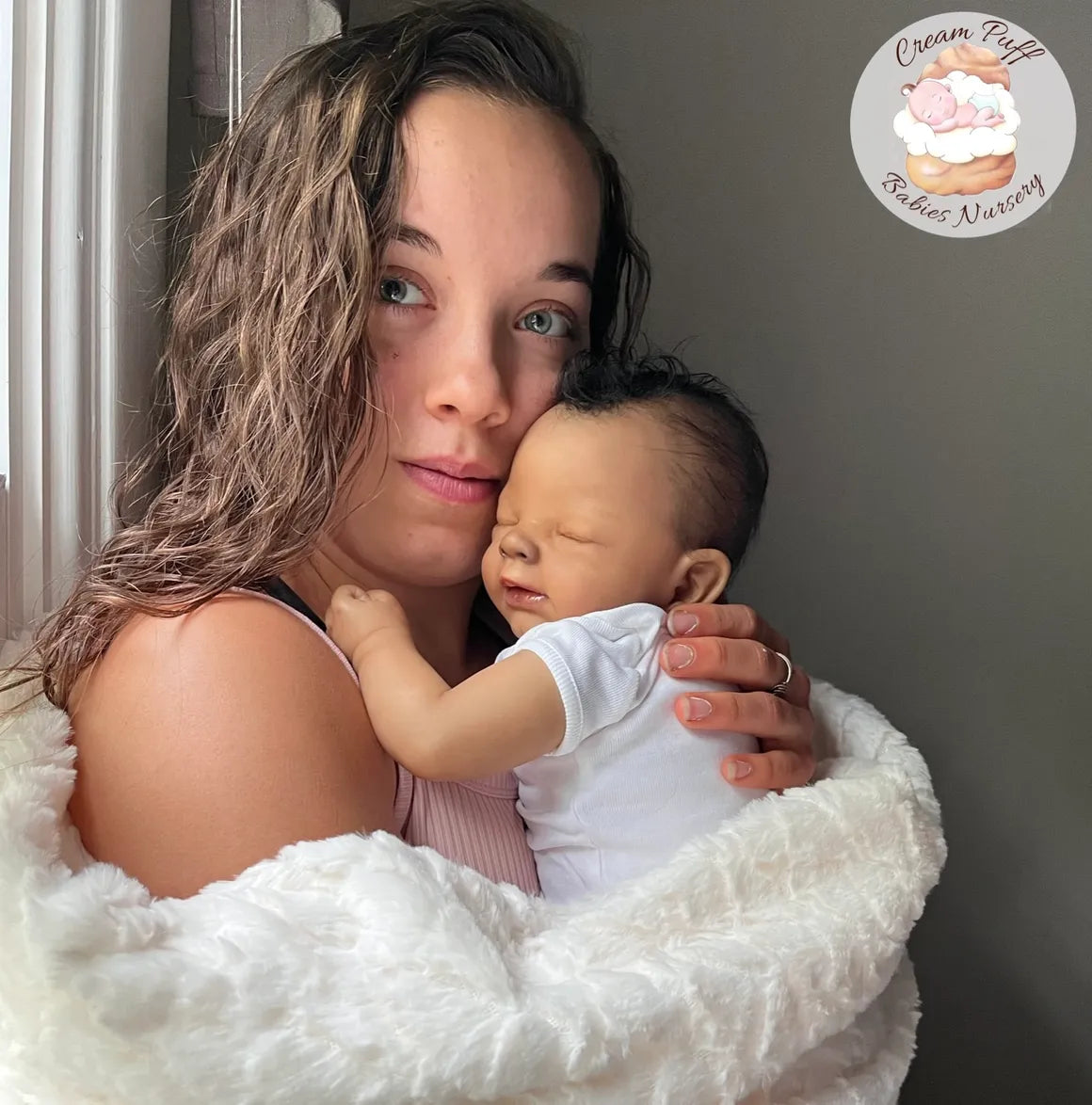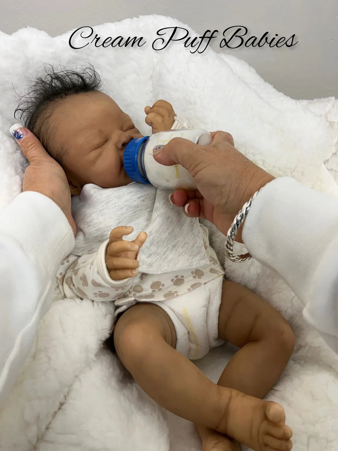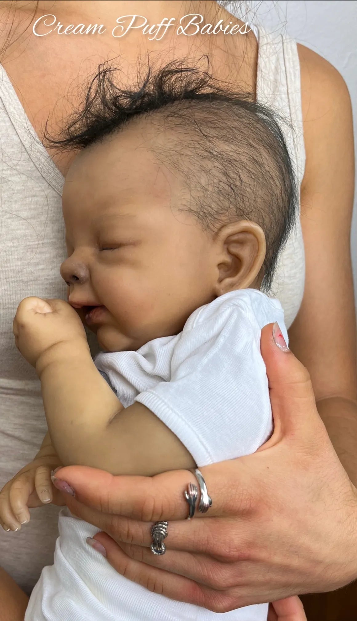 “As in real life, each baby's skin tone is unique. Multiple artistic techniques were used to achieve the desired biracial/ African American skin complexion for Gideon. The vinyl was colored on the outside to give the most realistic premature "blotchy" skin tones. This natural shade of coloring was created by using various shades of Genesis heat set paints, which I've applied over multiple layers to achieve the depth of detail and true to life look I envisioned. I handled him delicately, and spent extra time and care creating, enhancing, and developing his realistic features.“