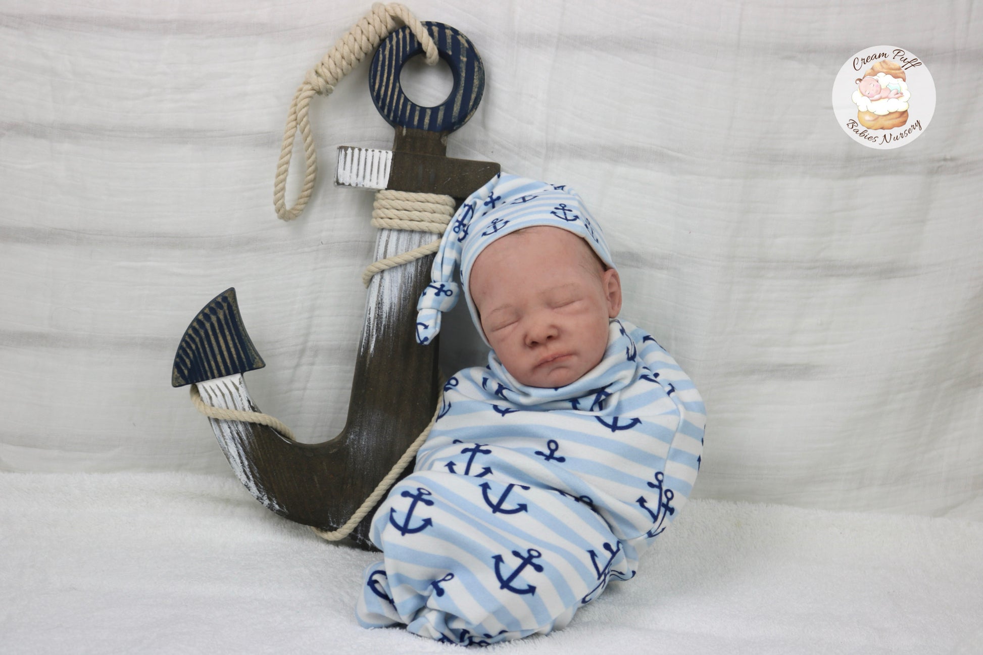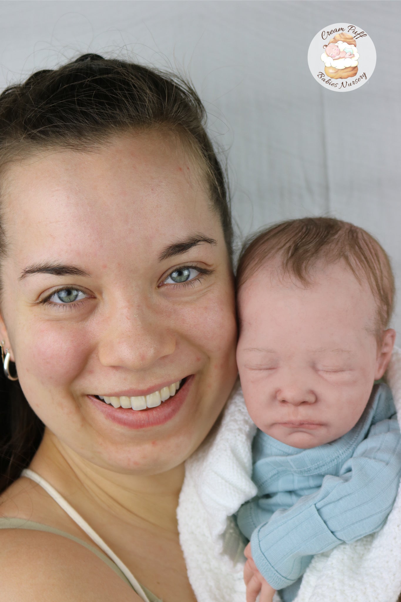 This sleepy little boy came into the nursery as “Noah” by Severine Piret. This partial silicone kit to start out with was a blank neutral pale skin tone silicone and was put through our reborn process to enhance his realism and lifelike, newborn look.